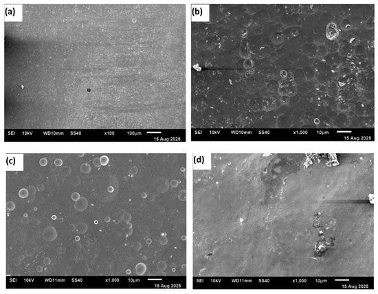 SEM images of the surface morphology of samples after potentiodynamic polarization scans in different electrolytes: (a) 20% NaNO3, (b) 20% NaNO3 + 10 mM HNO3, (c) 20% NaNO3 + 10 mM citric acid, and (d) 20% NaCl.