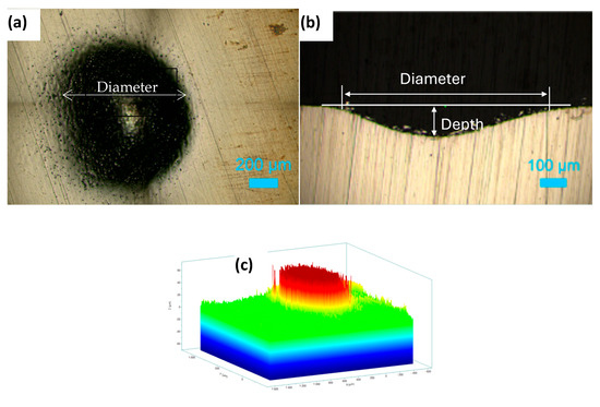 Electrochemical drilling of a hole in HEA by potentiostatic dissolution at 11 V in 1 M NaNO3 for 20 min (recorded current: 10–15 mA; counter electrode: Pt wire, 120 μm diameter). (a) Top-view image of the drilled hole (diameter ≈ 850 μm), (b) cross-sectional view showing hole depth ≈ 100 μm, and (c) corresponding depth profile.