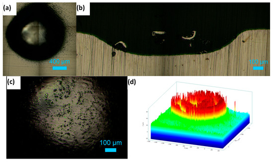 Electrochemical drilling of a hole in HEA by potentiostatic dissolution at 11 V in 1 M NaNO3 + 10 mM citric acid for 20 min (recorded current: 10–12 mA; counter electrode: Pt wire, 120 μm diameter). (a) Top-view image of the drilled hole (diameter ≈ 1587 μm), (b) cross-sectional view showing hole depth ≈ 234 μm, (c) image of the bottom surface, and (d) depth profile of the hole.