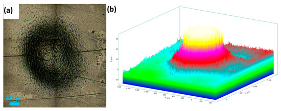 Electrochemical drilling of a hole in HEA by potentiostatic dissolution at 5 V in 1 M NaNO3 + 10 mM citric acid for 20 min (counter electrode: Pt wire, 120 μm diameter). (a) Top-view image of the drilled hole (diameter ≈ 503 μm), and (b) depth profile showing hole depth ≈ 70 μm.