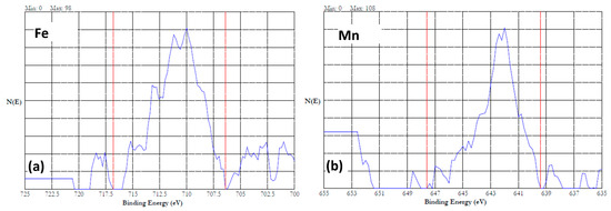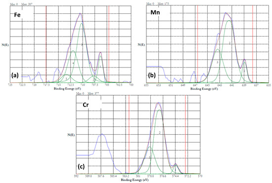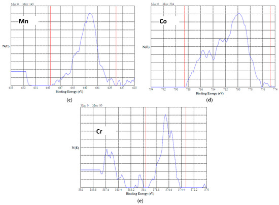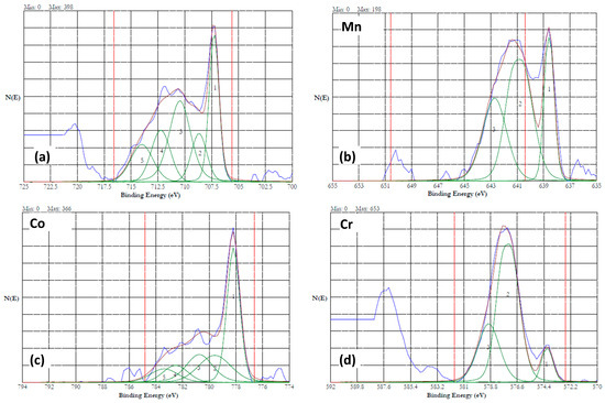 The Cr(III), present in Cr2O3, will have five multiple peaks of equal FWHM (0.9 eV) in the range of 575.7–578.9 eV [47]. The Cr(0) is characterized by one asymmetric peak with a FWHM of 0.9 eV in the range from 573.9 to 574.5 eV. The 2p3/2 peak of Fe(0) occurs at 706.6 eV with a FWHM of 0.88 eV, and the 2 p1/2 peak is at 719.7 eV. The 2p3/2 spectrum of Fe(III) in Fe2O3 could split into six peaks occurring at 709.8, 710.8, 711.6, 712.7, 713.7, and 719.3 eV [42]. The Mn(0) exhibits a 2p3/2 peak at 638.64 eV with a 2p3/2 to 2p1/2 splitting of 11.10 eV [48]. The 2p3/2 spectrum of Mn(II) in MnO has six peaks in the range of 640.2–645.9 eV, while the 2p3/2 spectrum of Mn(III) in Mn2O3 has five peaks in the range of 640.8–646.2 eV [47]. The 2p3/2 spectrum of Co(0) shows three peaks in the range of 778.1–783.1 eV, while the Co(II) in CoO shows four peaks in the range of 780–786.5 eV. The 2p3/2 spectrum of Co(III) in CO3O4 shows four peaks in the range of 779.6–785.2 eV [47].