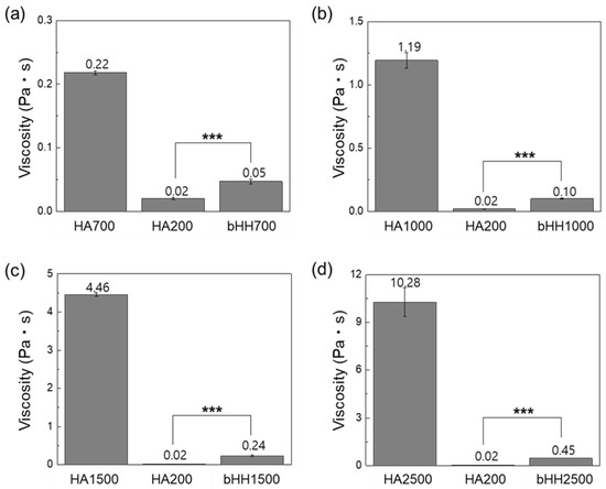 Solution viscosity of linear (a) HA700, (b) HA1000, (c) HA1500, and (d) HA2500. HA200 was coupled to the backbone of linear HA to synthesize bHH ([polymer] = 1 wt%, distilled water, 37 °C; mean ± standard deviation, n = 4, Student’s t-test, *** p < 0.001).