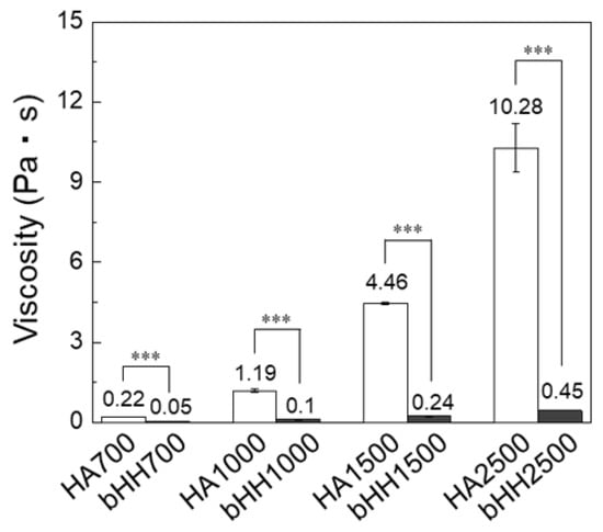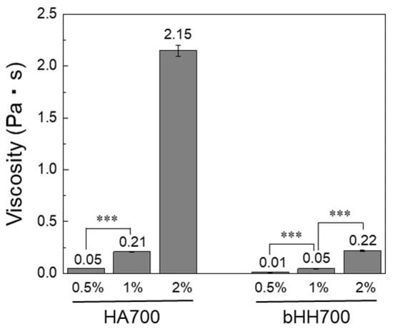 Concentration-dependent viscosity of HA700 and bHH700 (distilled water, 37 °C; mean ± standard deviation, n = 4, Student’s t-test, *** p < 0.001).