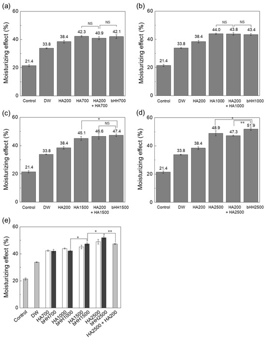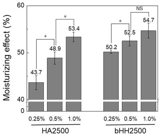 Moisturizing effect of HA2500 and bHH2500 at different concentrations (37 °C, 1 h; mean ± standard deviation, n = 4; Student’s t-test; NS, not significant; * p < 0.05).