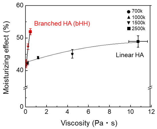 Moisturizing effect vs. solution viscosity for linear and branched HAs (mean ± standard deviation, n = 4).
