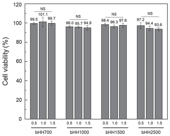 Relative viability (to cell-only control) of human dermal fibroblasts treated with various concentrations of bHH solutions ([polymer] = 0.5−1.5 mg/mL, 37 °C, 24 h; mean ± standard deviation, n = 4, Student’s t-test; NS, not significant).