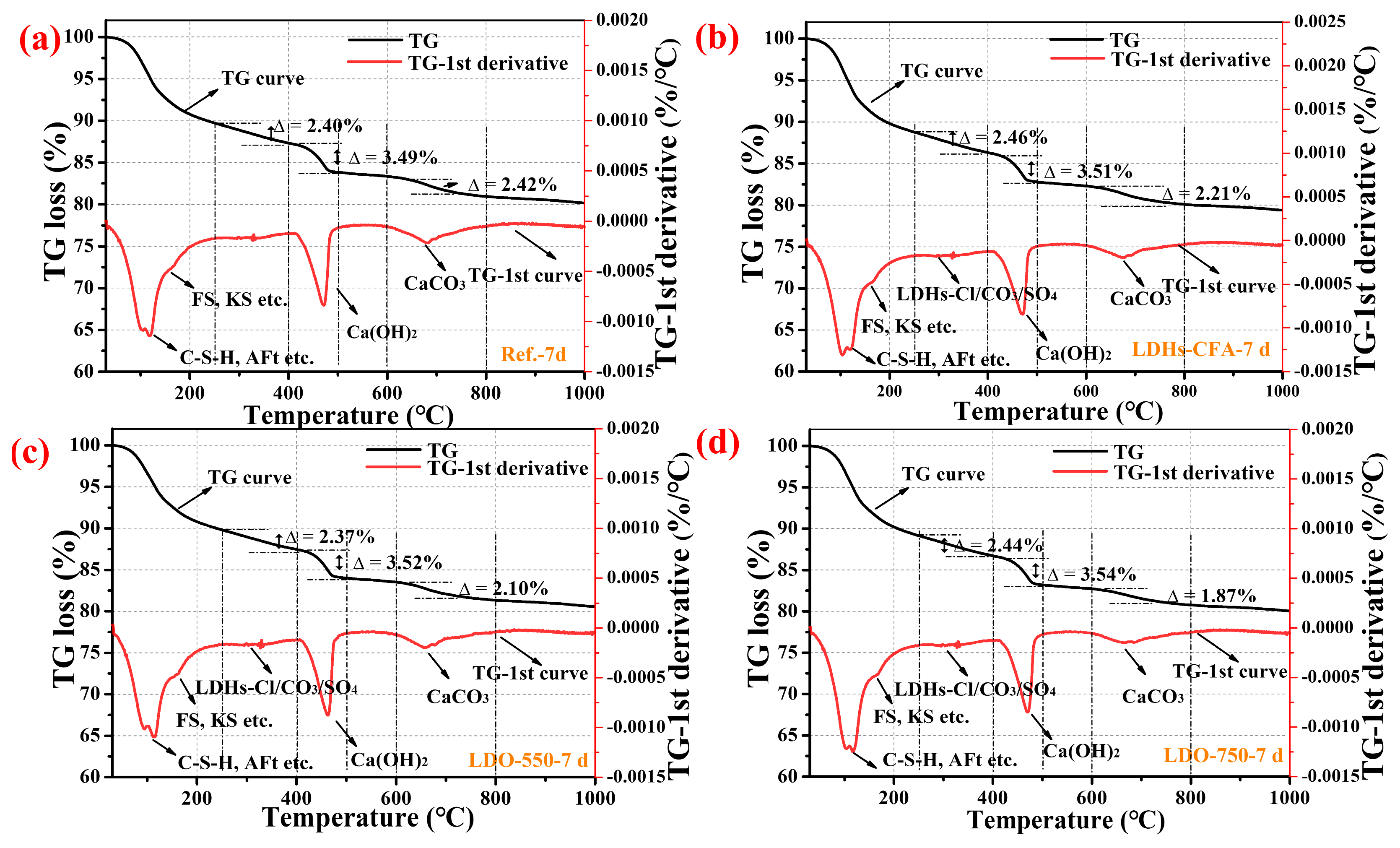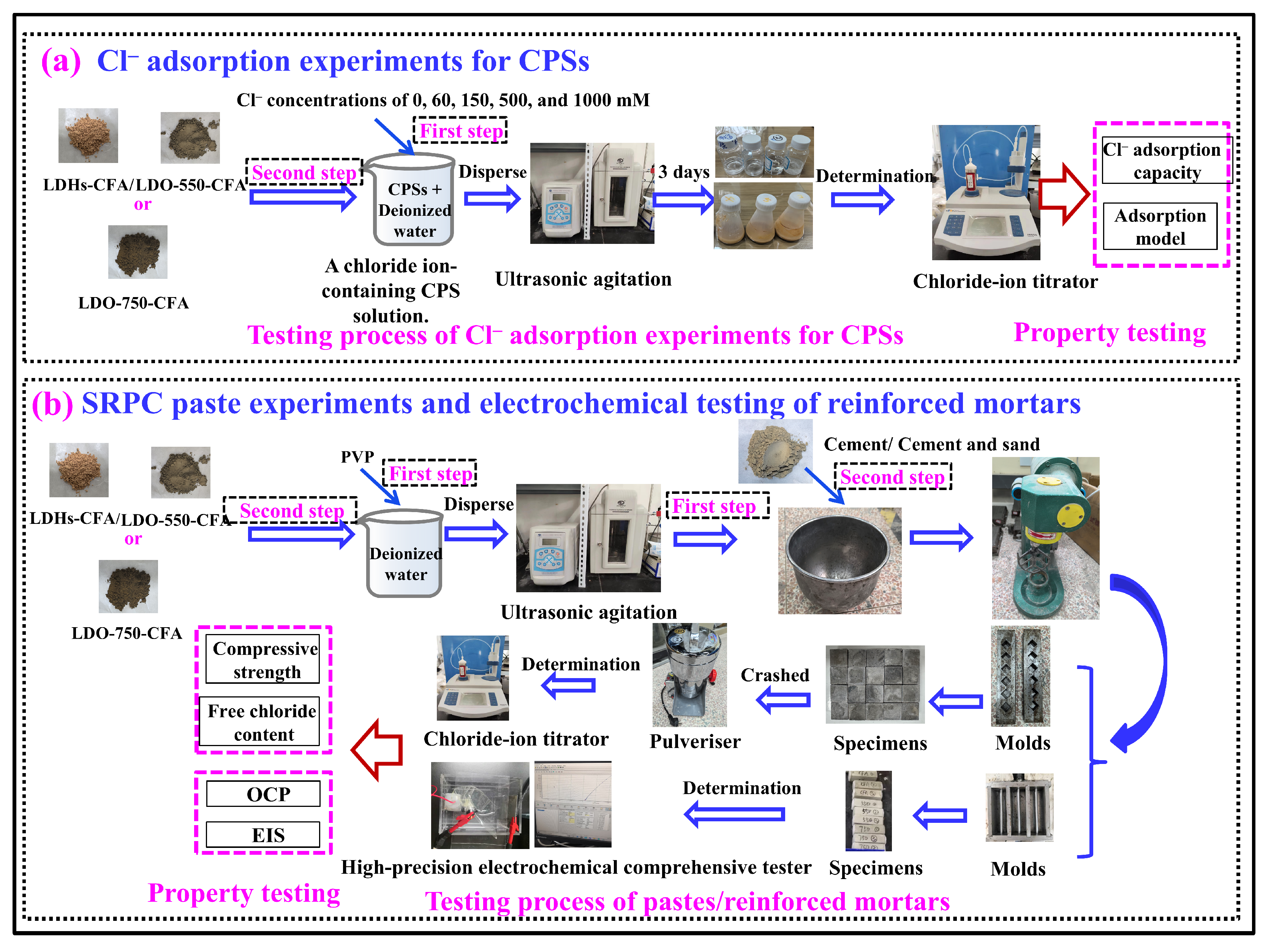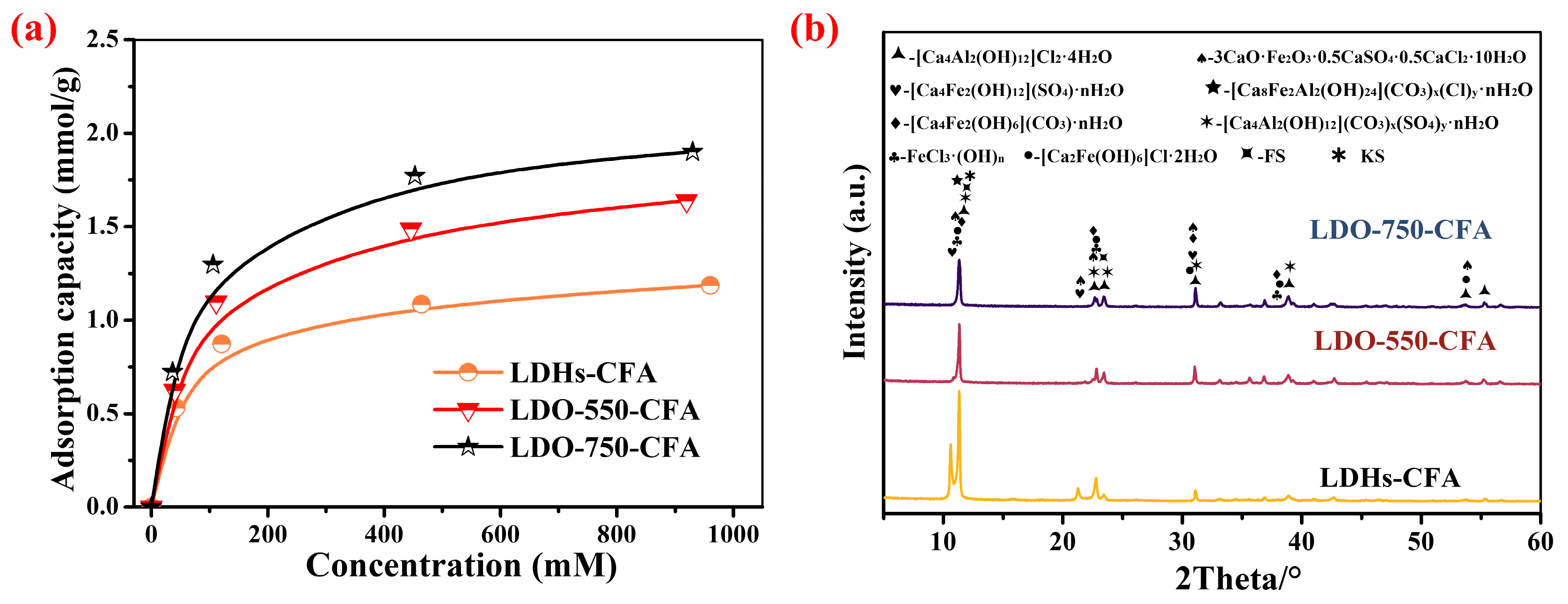 - LDO-CFA shows a high Cl− adsorption capacity in both CPSs and cement-based materials. The process follows the Langmuir model, suggesting uniform monolayer adsorption. LDO-750-CFA showed a peak capacity of 1.98 mmol/g in CPSs, surpassing LDHs-CFA by 60.1%. The long-term efficacy was confirmed in SRPC pastes, where free Cl− was lowered to 0.255–0.293% after 28 days of curing.