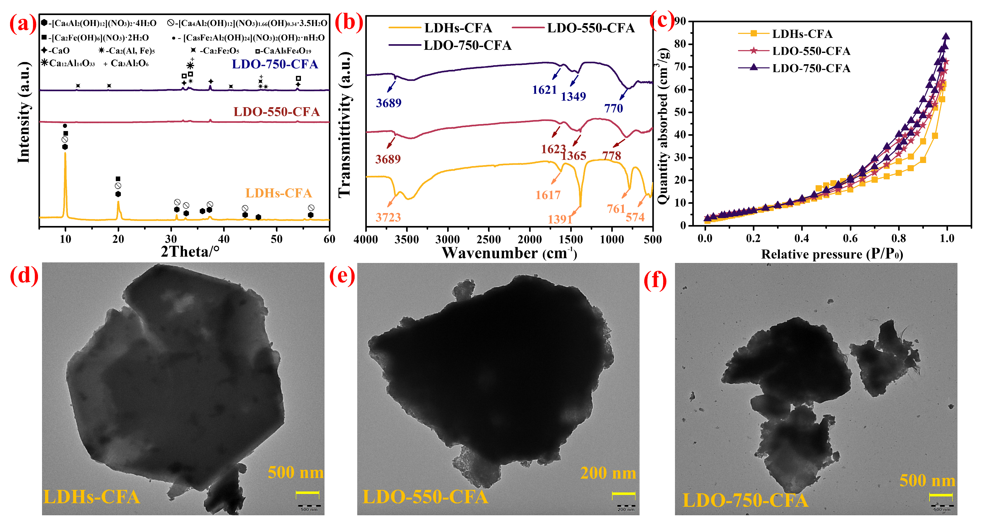 - The chemical composition and microstructure of LDO-CFA calcined at 550 and 750 °C were characterized by XRD, FTIR, BET, SEM mapping, and TEM. Calcination of the LDO-CFA system generates several crystalline phases, namely CaO, CaAl8Fe4O19, Ca2(Al, Fe)O5, Ca2Fe2O5, Ca12Al14O33, and Ca3Al2O6.