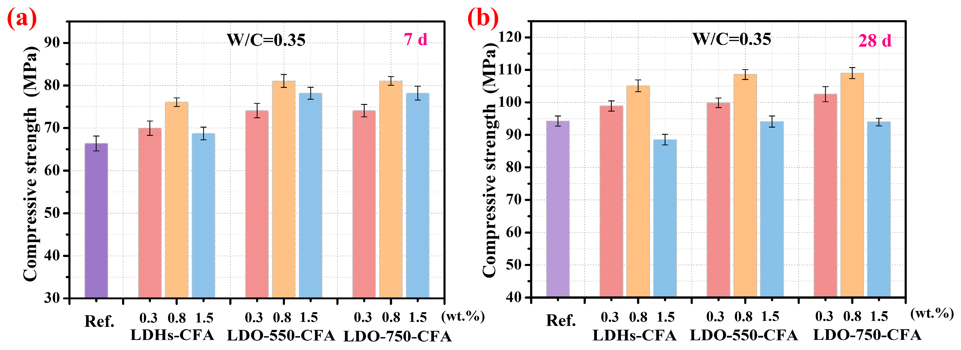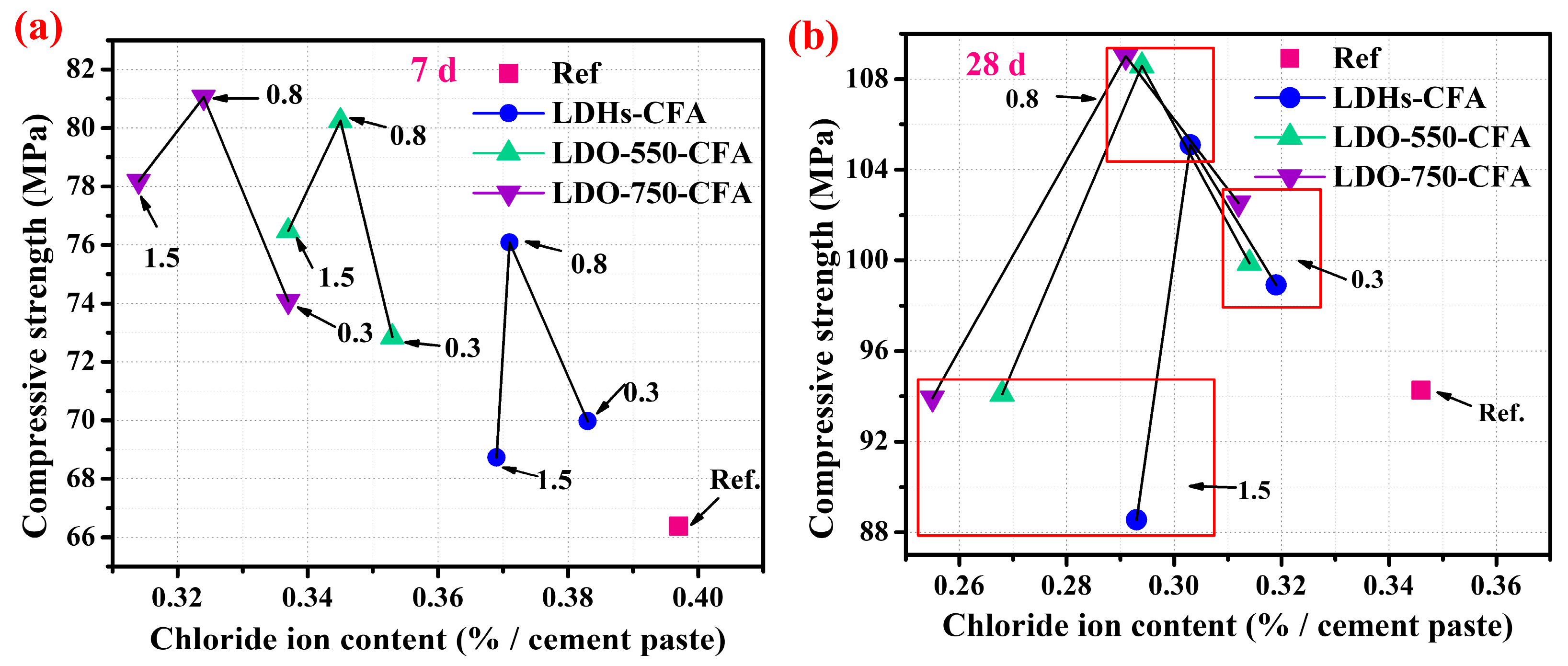 - At an optimal dosage of 0.8 wt.%, the LDO-750-CFA paste significantly improved the compressive strength of the SPRC paste, increasing it by 22.1% at 7 days and 15.6% at 28 days compared to the control. At 0.8 wt.%, the 28-day paste achieves an optimal balance, exhibiting 16.1% Cl− adsorption efficiency while retaining a compressive strength exceeding 109 MPa.