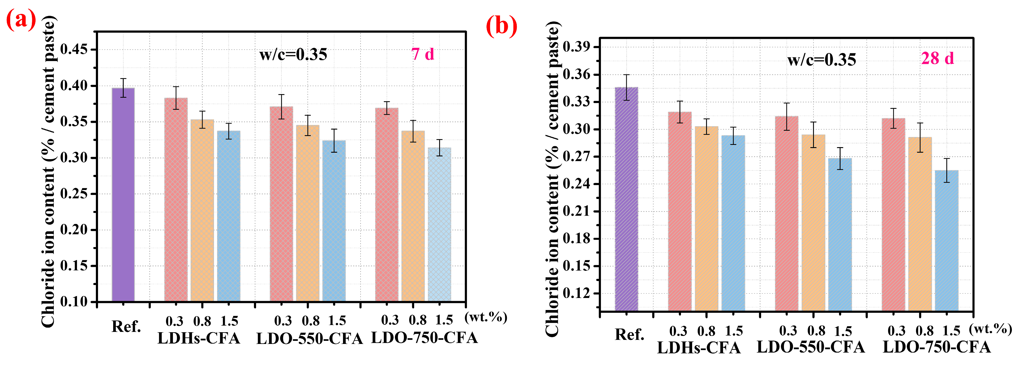 - Geng, J.; Pan, C.; Wang, Y.; Chen, W.; Zhu, Y. Chloride binding in cement paste with calcined Mg-Al-CO3 LDH (CLDH) under different conditions. Constr. Build. Mater. 2021, 273, 121678. [Google Scholar] [CrossRef]