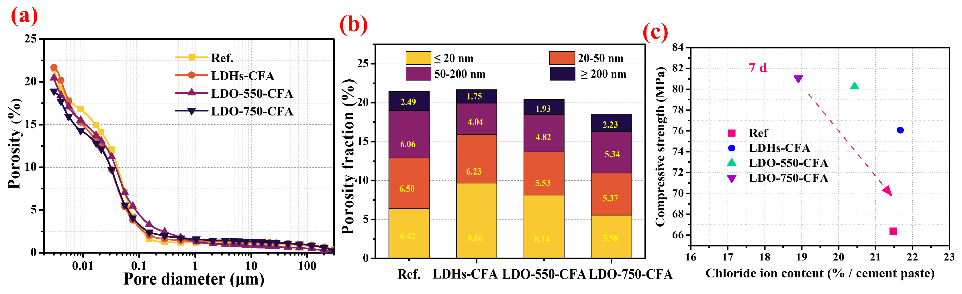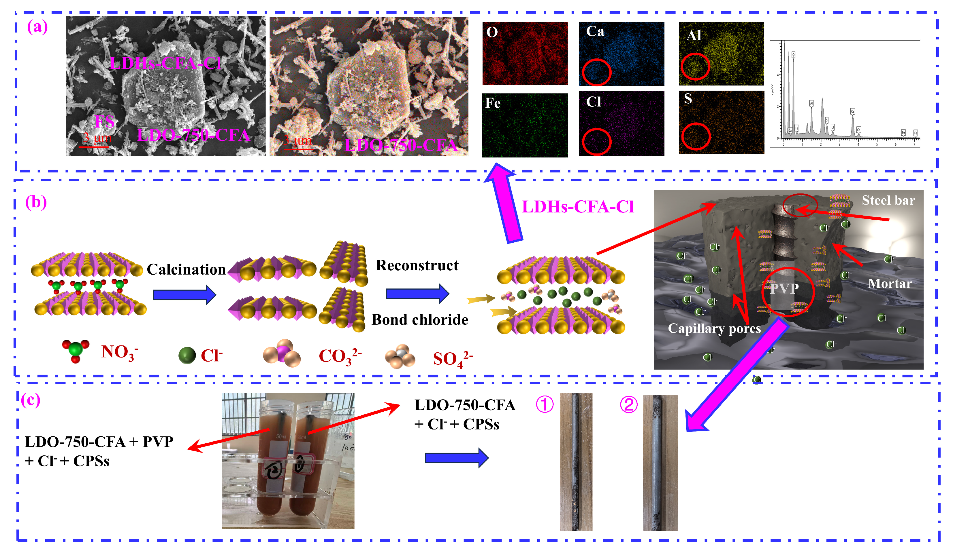 - This improvement originates from synergistic mechanisms within the mortar: LDO-750-CFA refines the pore structure and adsorbs Cl−, while the Fe3+ from it rapidly forms a protective passivation film. This effect is further boosted by PVP, which ensures the uniform dispersion of LDO-750-CFA and concurrently contributes an organic passive film.