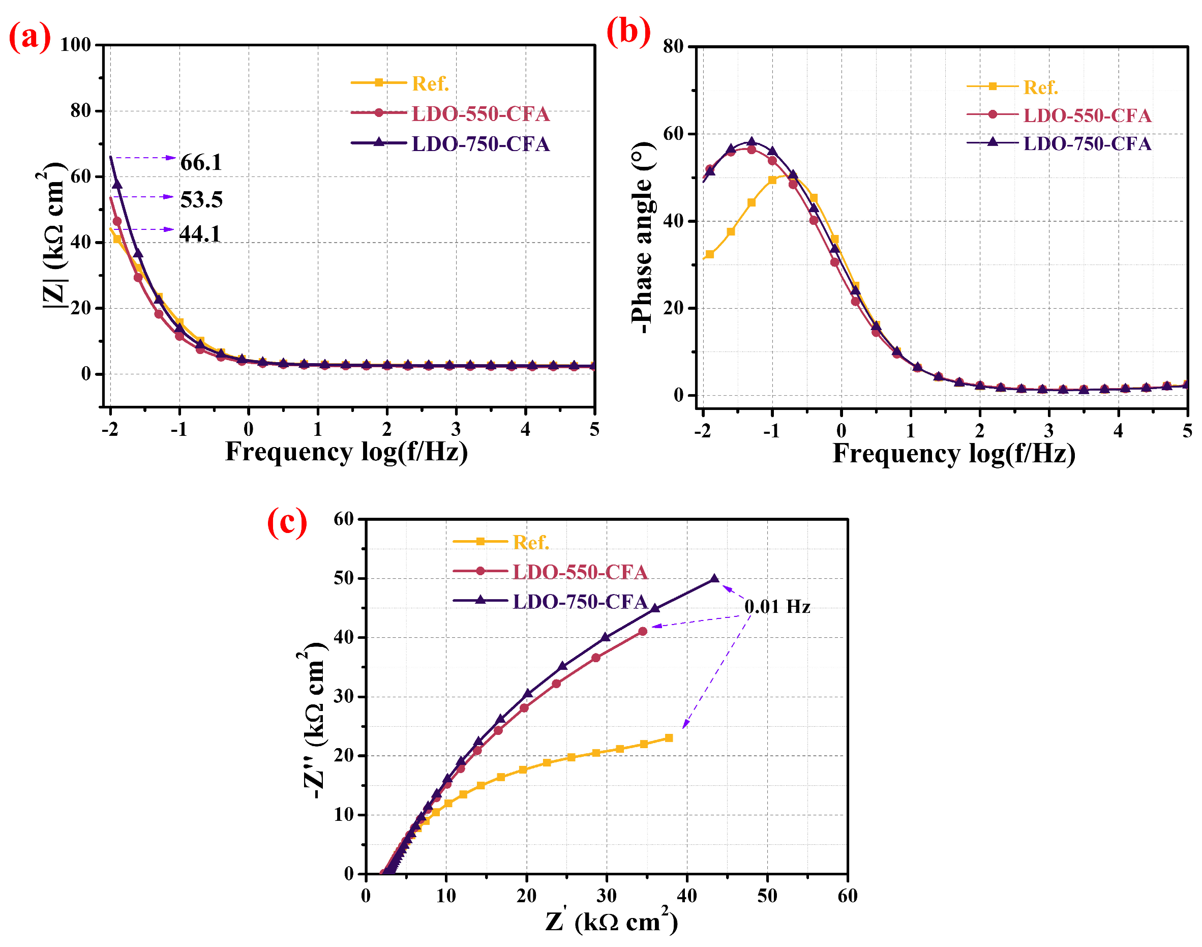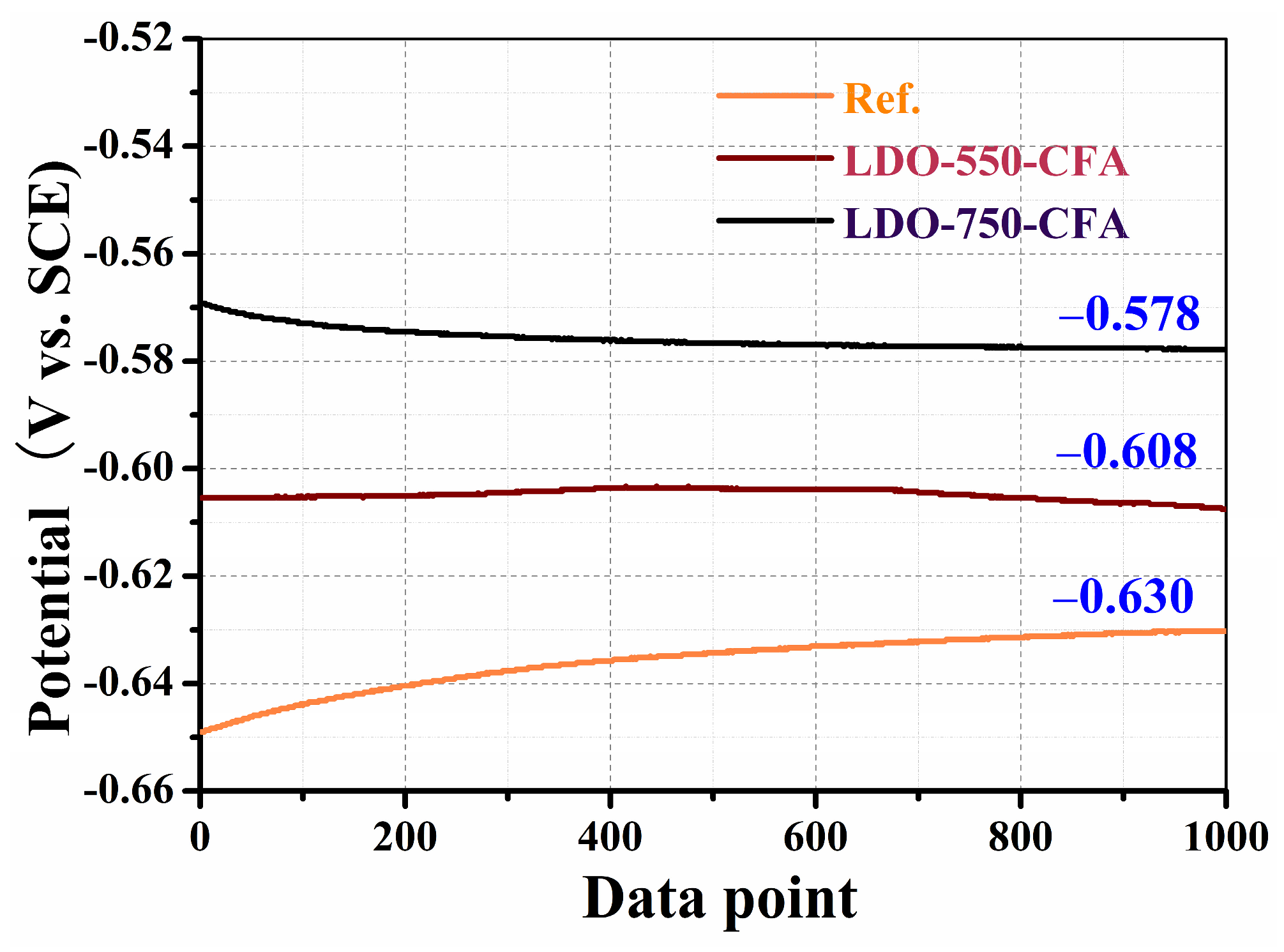 - Electrochemical tests revealed that, compared to the control, the LDO-750-CFA specimen improved the corrosion resistance of reinforced mortar by increasing the OCP, impedance arc radii, |Z|0.01 values, Rp, Rf, Rct, and inhibition efficiency, while reducing the Cf and Cdl. It also delayed the initiation of steel corrosion.