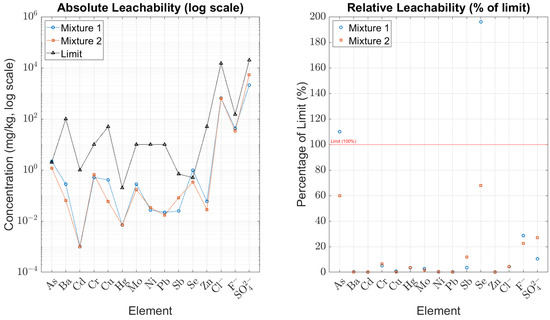 Leaching tests are a widely accepted method for evaluating the chemical stability and environmental compatibility of geopolymeric materials. In this study, leachability tests were commissioned for all analyzed mixtures and conducted by AP Geotechnika Porsze, Kapica Sp. k. (Poland) in accordance with PN-EN 12457-2:2006 standard [39,40]. Major and trace metal concentrations (As, Ba, Cd, Cr, Cu, Hg, Mo, Ni, Pb, Sb, Se, Zn) in the leachate were determined using inductively coupled plasma optical emission spectroscopy (ICP-OES) following PN-EN ISO 11885:2009. Dissolved organic carbon (DOC) was measured using a TOC/DOC analyser, while anions (chlorides, fluorides, sulphates), hexavalent chromium, total dissolved solids (TDSs), and pH were determined using standard water and wastewater analysis methods.