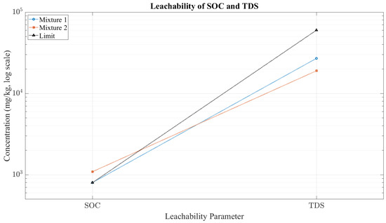 The differences observed can be linked to their compositions. Mixture I, activated with 16 M NaOH, contains a higher effective proportion of MT, since it is not diluted with sand. This composition promotes higher alkalinity and greater ionic mobility, which is consistent with its elevated arsenic and selenium release. In contrast, Mixture II, which incorporates Baucis waterglass together with a substantial sand fraction, has a lower relative MT content. This dilution effect reduces heavy metal mobility but is associated with a slight increase in SOC, likely influenced by the presence of cellulose and other organic modifiers. Both mixtures exhibit generally favourable leaching behaviour. Mixture I requires caution owing to its release of arsenic and selenium, while Mixture II is slightly non-compliant due to elevated SOC levels. Overall, the results support their potential for low-impact applications, provided that appropriate waste management protocols are followed.