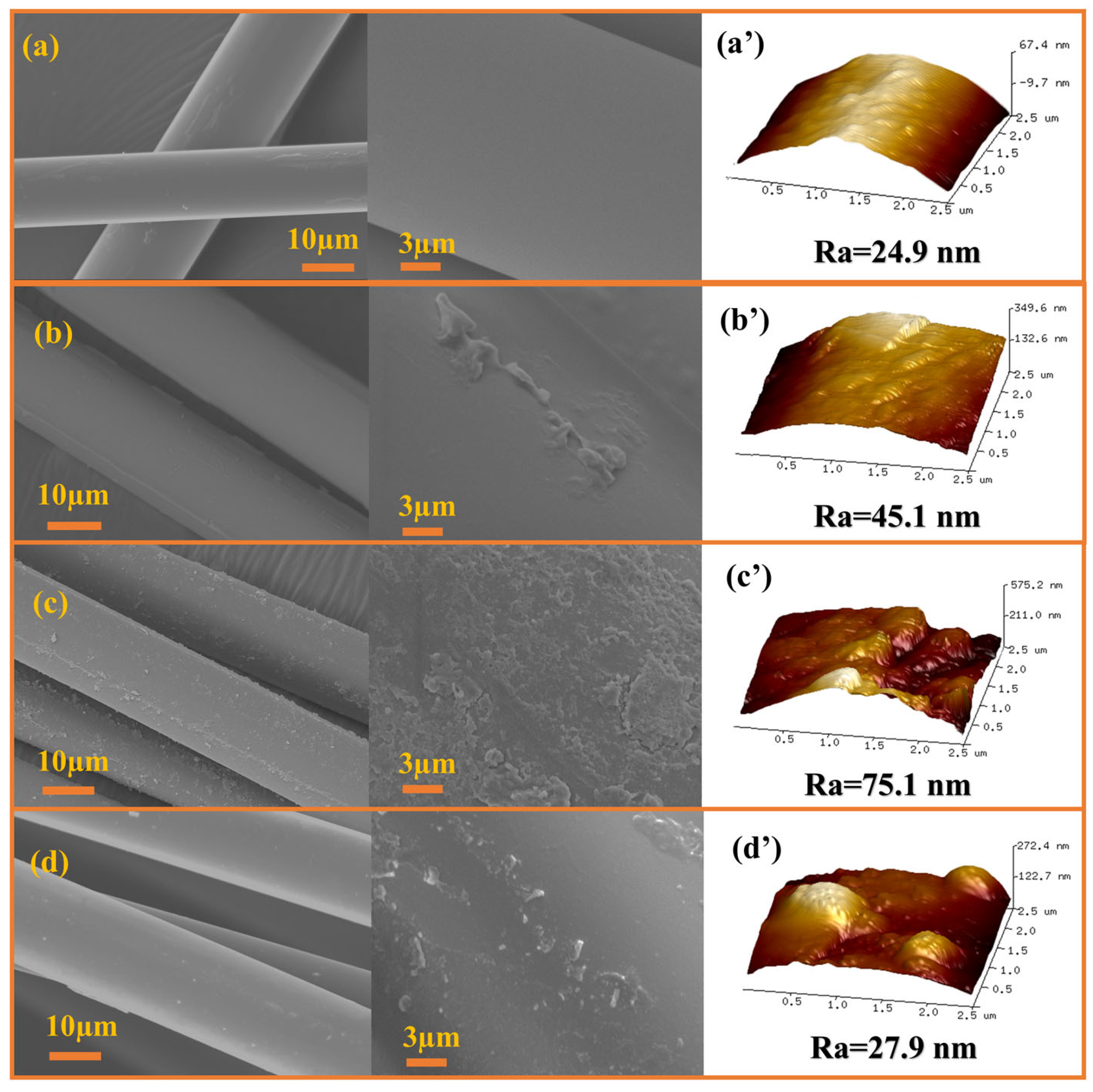 Figure 2. SEM and AFM images of different GF morphologies: (a,a′) untreated GF, (b,b′) GF-A1, (c,c′) GF-A2 and (d,d′) GF-A3.