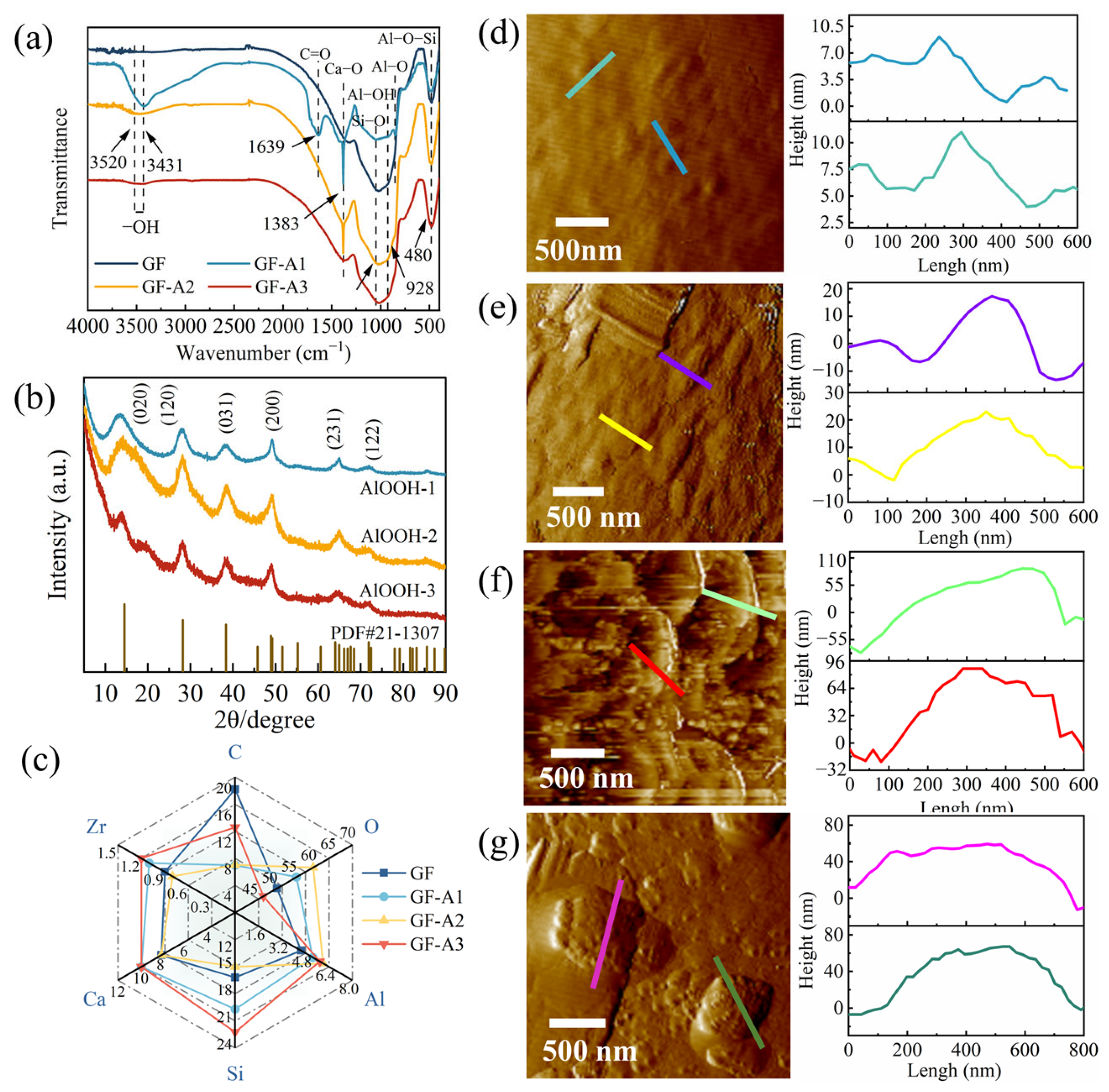 Figure 3. (a) XRD spectrum of AlOOH samples. (b) FTIR spectrum and (c) EDS results of GF samples. The corresponding height profiles of (d) untreated GF, (e) GF-A1, (f) GF-A2 and (g) GF-A3.