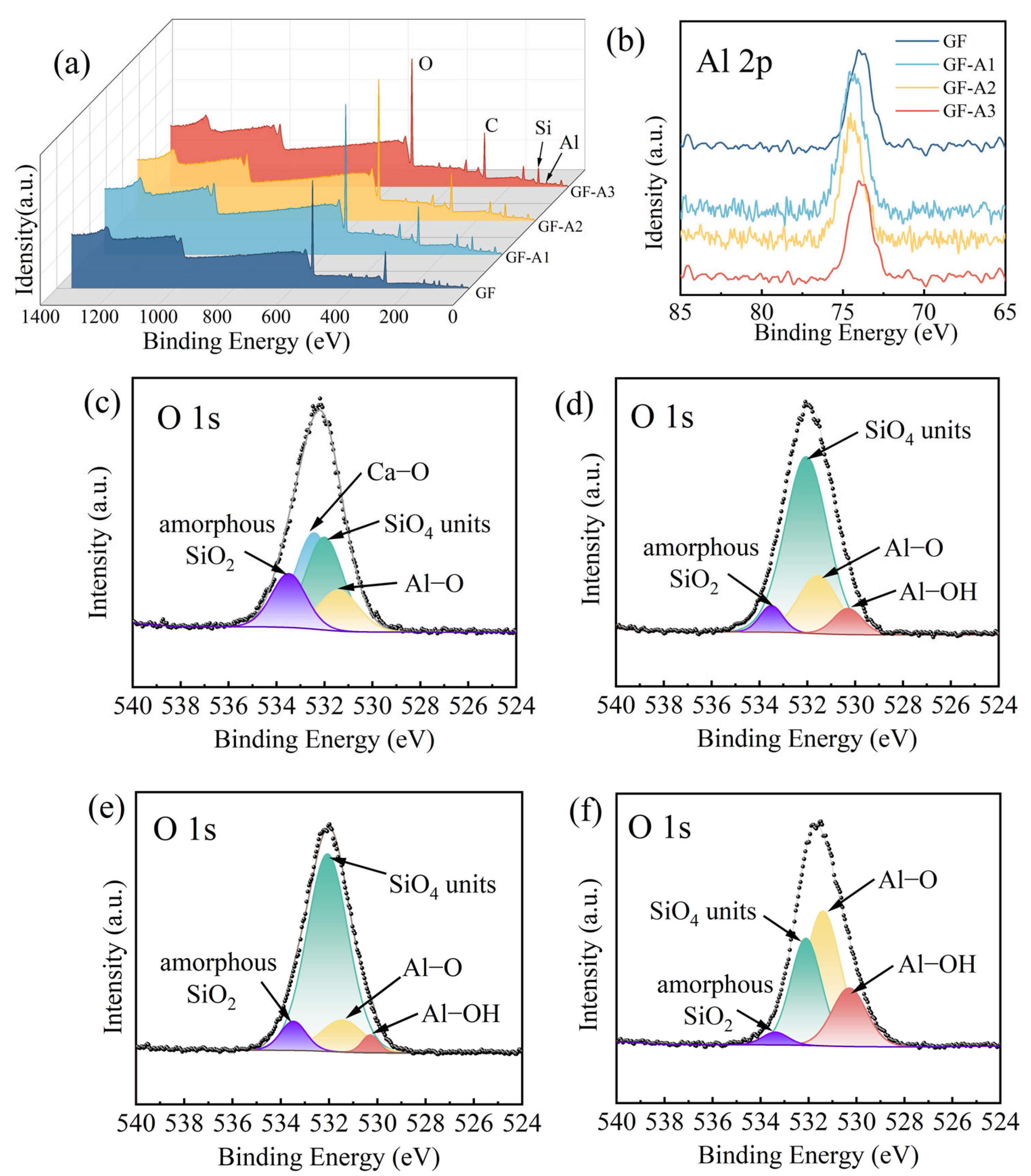 Figure 4. (a) Wide-scan XPS spectra and (b) Al2p spectra of GF samples. O1s spectra of (c) untreated GF, (d) GF-A1, (e) GF-A2 and (f) GF-A3. (The grey line: fitting curve; black circles: raw data.)