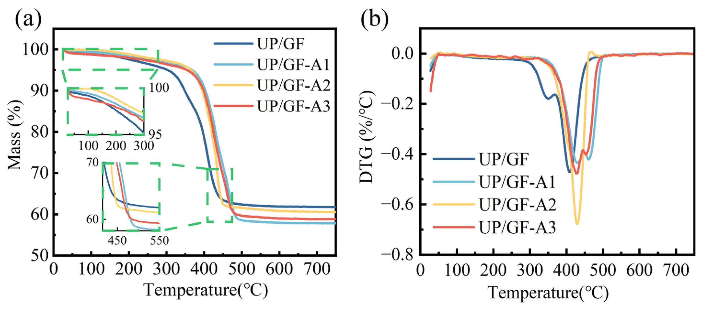 The thermal stability of different UP/GF composites was investigated using the TGA results, as shown in Figure 6a. All UP/GF samples showed a slight mass loss at 28–48 °C due to the evaporation of bound water. The UP in the composites began to decompose from 120 °C and the mass loss reached 6.6% until 320 °C, attributed to the degradation of thermal stabilizers and other additives. Significant decomposition occurred between 320 °C and 430 °C, corresponding to the breakdown of the resin matrix (Figure S1b), with a final mass residue of 61.8% at 750 °C for UP/GF. The above thermal behavior of UP composites was in agreement with Laoubi et al. [50]. In the case of UP/GF-AlOOH samples, the mass loss until 370 °C was 4.9%, 5.2% and 5.9% for UP/GF-A1, UP/GF-A2 and UP/GF-A3, respectively. The thermal degradation process from 28 to 370 °C showed that nano-AlOOH-grafted composites improved the stability of the composites by reducing their weight loss and delaying the start temperature of the UPs’ decomposition. The strong chemical bonds such as Si–O–Al and C–C were formed between the AlOOH layer and the silane coupling agent at the GF/UP interface. Such a covalent bond network limited the mobility of UP chain segments adjacent the fiber surface,thereby delaying enhancing the thermal stability of the resin. [51]. At 750 °C, the residual masses of UP/GF-A1, UP/GF-A2 and UP/GF-A3 were 57.8%, 60.6% and 58.8%, respectively. A smaller residual mass corresponded to a higher amount of nano-AlOOH attached to the fiber surface. [48].