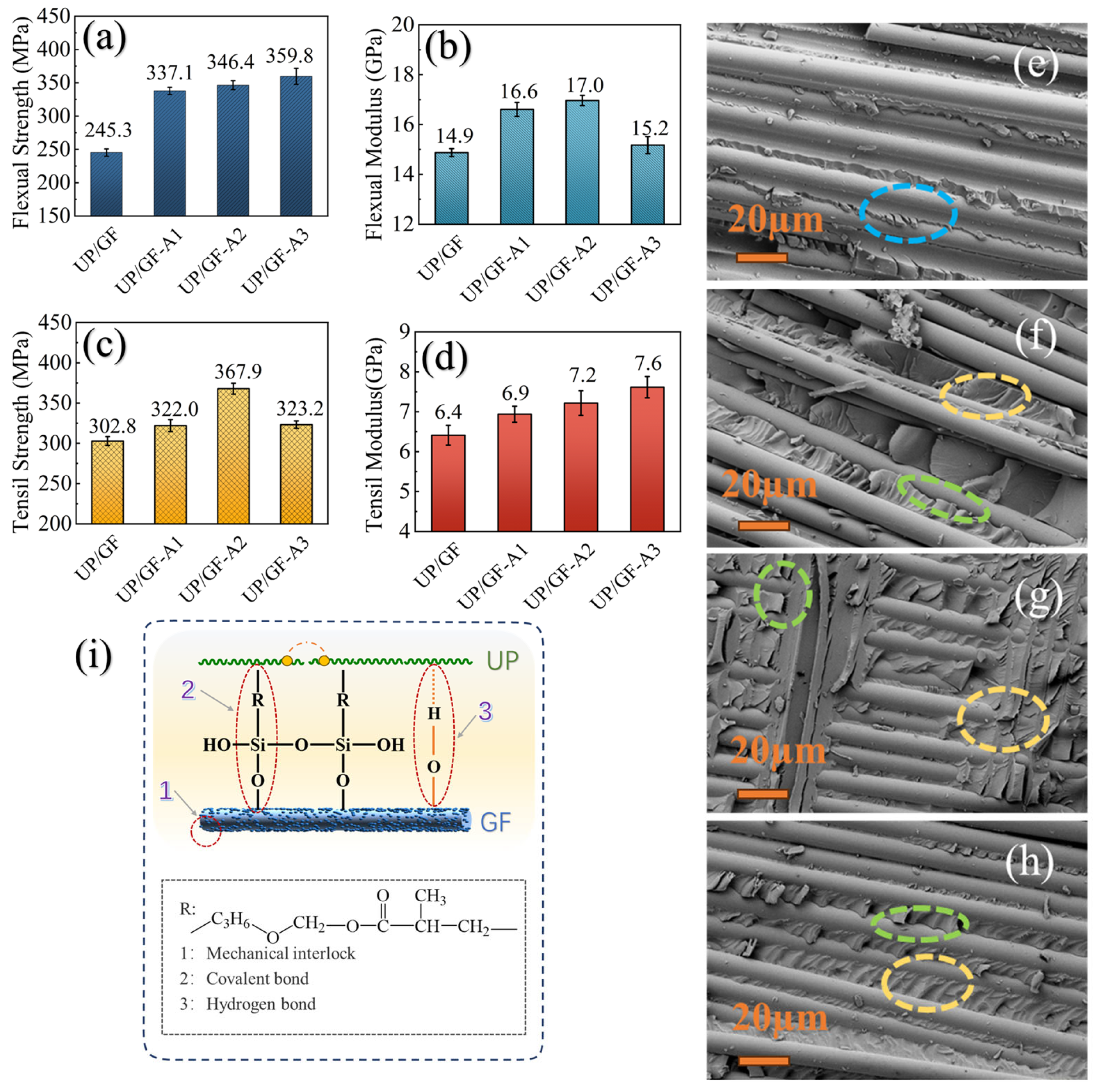 Figure 7. Mechanical properties of UP composites: tensile strength (a), tensile modulus (b), flexural strength (c) and flexural modulus (d). SEM images of fracture cross section after tensile test of the composites reinforced by (e) untreated GF, (f) GF-A1, (g) GF-A2 and (h) GF-A3. Schematic diagram of the possible interactions between GFs and UP chains (i). (Blue line: smooth displacement; green line: matrix cracking; yellow line: matrix fracture.)