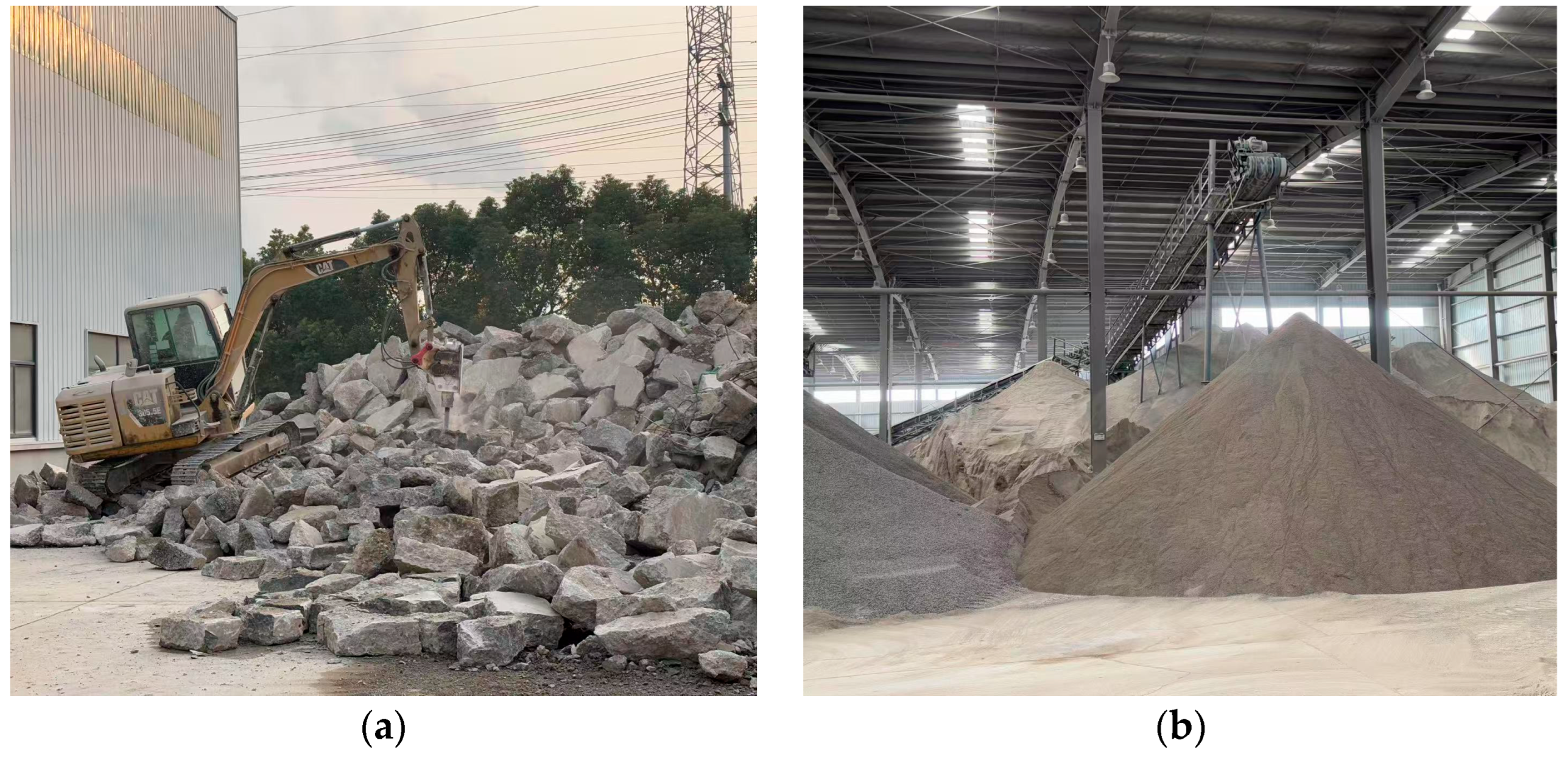 - Vahidi, A.; Mostaani, A.; Gebremariam, A.T.; Di Maio, F.; Rem, P. Feasibility of utilizing recycled coarse aggregates in commercial concrete production. J. Clean. Prod. 2024, 474, 143578. [Google Scholar] [CrossRef]