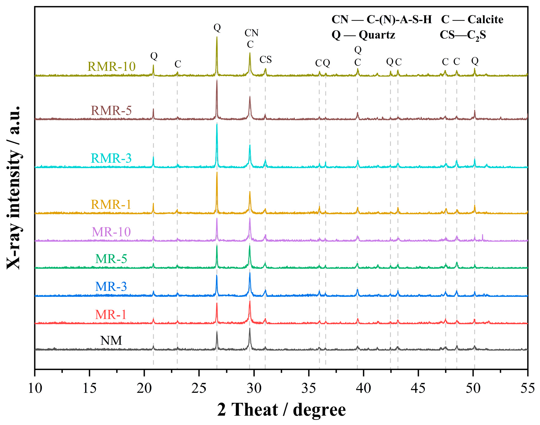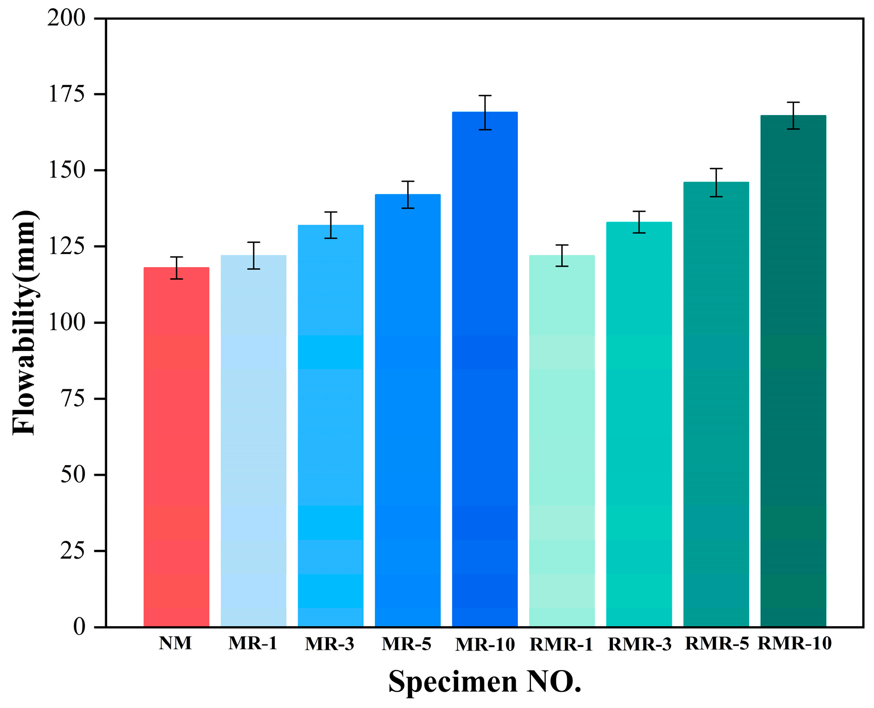 - Using RNMS as an alkali activator raw material can ensure performance advantages at different MRFA dosages. Although RMRs exhibit slightly slower early strength development and have slightly higher capillary water absorption and drying shrinkage strain than MRs with the same MRFA content, their performance is still far superior to that of the blank NM group, and their fluidity is basically consistent with that of MRs. This indicates that RNMS, as an alkali activator raw material, can effectively promote the alkali activation reaction of the matrix and maintain the excellent performance of AASRMs with MRFA incorporation.