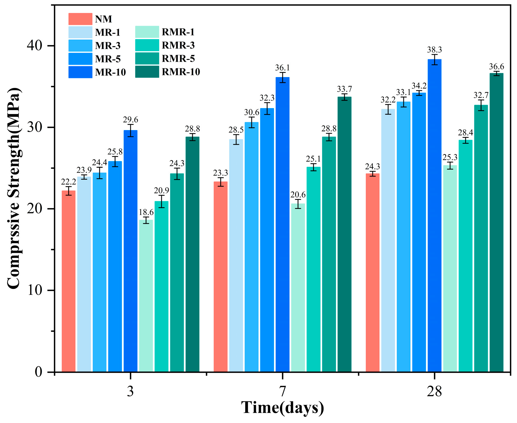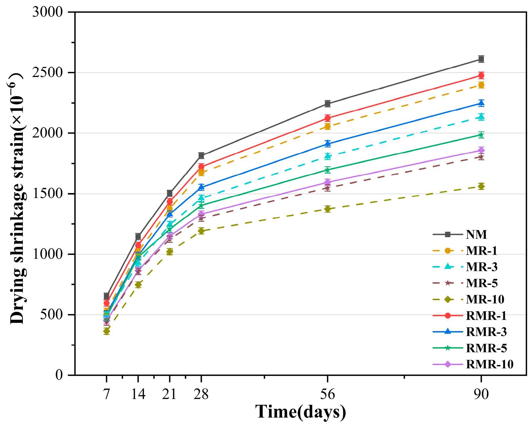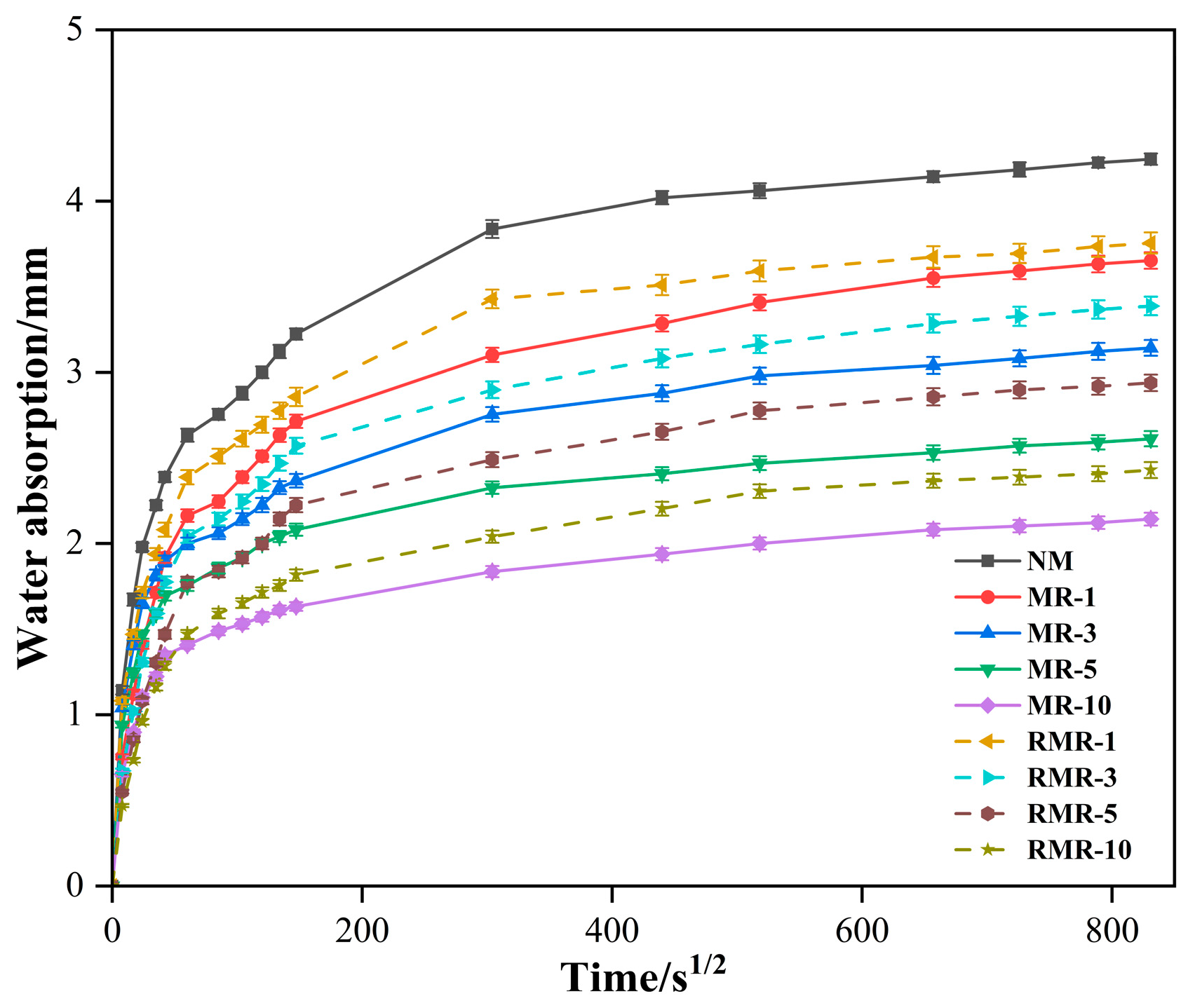 - Immersion modification of RFA using NMS significantly improved the overall performance of AASRMs. As the amount of MRFA added increased, the mortar’s workability improved significantly, while capillary water absorption and drying shrinkage were effectively suppressed, and the compressive strength was significantly enhanced. In particular, MR-10 achieved a 28-day compressive strength as high as 38.3 MPa, with capillary water absorption height and drying shrinkage strain reduced by 49.5% and 40.2%, respectively, compared to the control NM. This indicates that the incorporation of MRFA effectively remedied the defects of RFA, thereby improving the mechanical and durability properties of mortar.