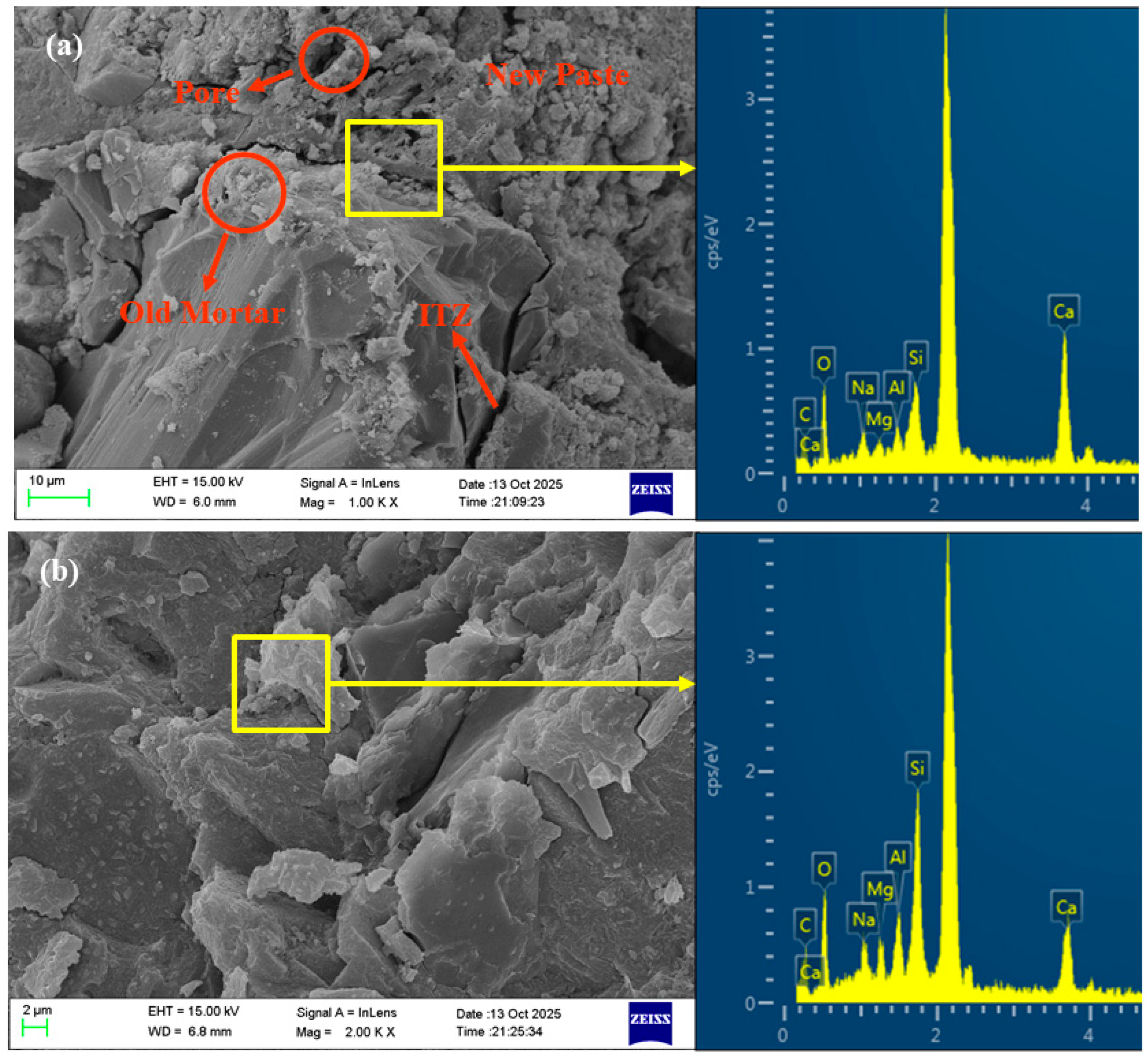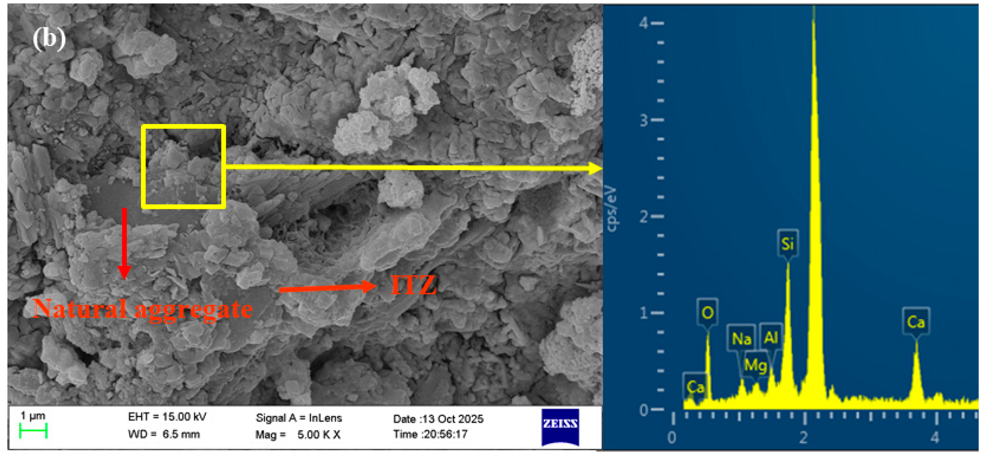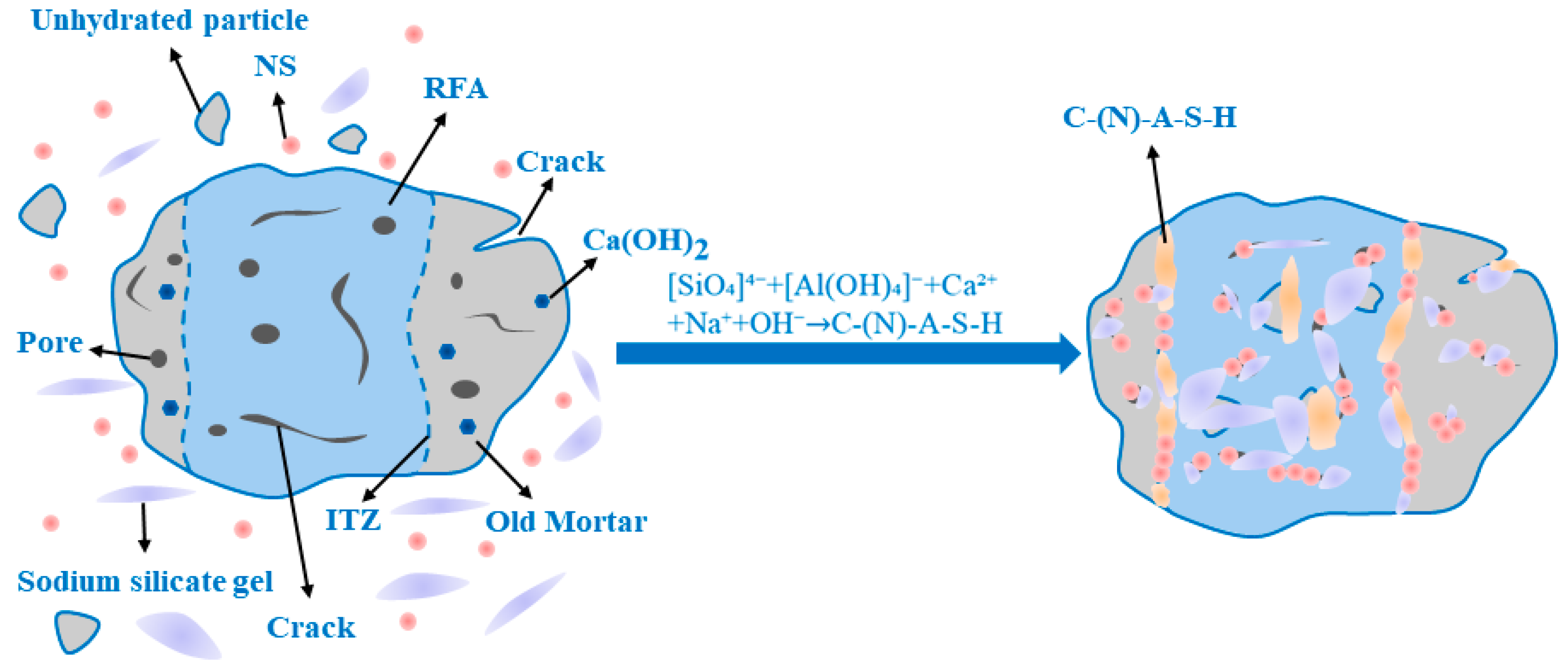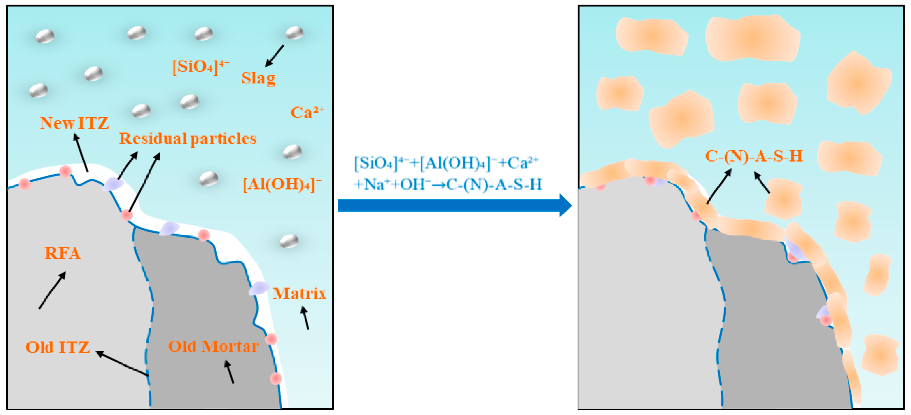 - The pores and cracks on the surface of the RFA were repaired through the filling effect of NS and the film-forming action of sodium silicate gel. This reduces the water absorption rate of MRFA and encapsulates loose microparticles to form a dense protective shell, thereby enhancing the stiffness of the aggregate. NS and sodium silicate can be transported into the RFA through microcracks, where they react with Ca2+ and Al3+ to form C-(N)-A-S-H gel, thereby strengthening the microstructure of the ITZ. Simultaneously, residual NS and sodium silicate particles on the surface of MRFA serve as nucleation sites, promoting the uniform growth and densification of C-(N)-A-S-H gel in the new ITZ, thus reinforcing the previously weak ITZ. This microstructure optimization effectively inhibited capillary water absorption and drying shrinkage and significantly improved the mechanical properties of the AASRMs.