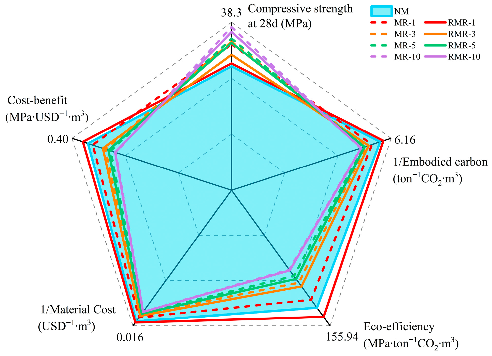 - From the perspectives of economics and the environment, although the incorporation of MRFA increases material costs and embodied carbon, the recycling and reuse of NMS significantly improve the eco-efficiency and cost-effectiveness of AASRMs. At low replacement rates, the overall benefits of RMR-1 surpassed those of the blank NM group, with the embodied carbon reduced by 11.9%. With the same amount of MRFA added, RMRs demonstrated better sustainability and higher cost-effectiveness than MRs. This confirms that the simultaneous use of RNMS and MRFA can enhance the performance of AASRMs while balancing economic and environmental benefits.