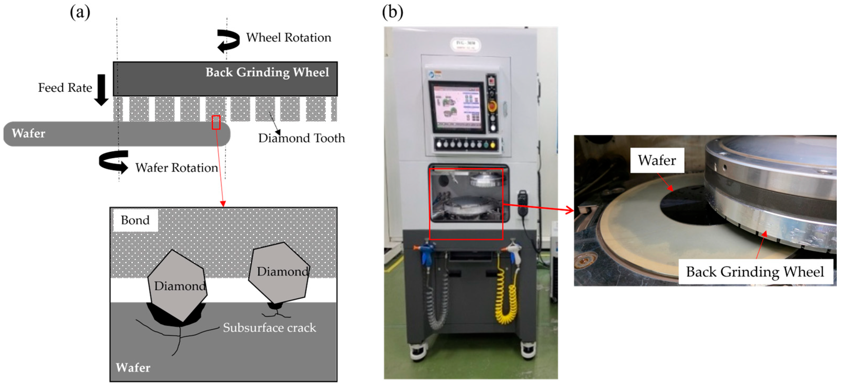 - Pei, Z.J.; Billingsley, S.R.; Miura, S. Grinding Induced Subsurface Cracks in Silicon Wafers. Int. J. Mach. Tools Manuf. 1999, 39, 1103–1116. [Google Scholar] [CrossRef]
