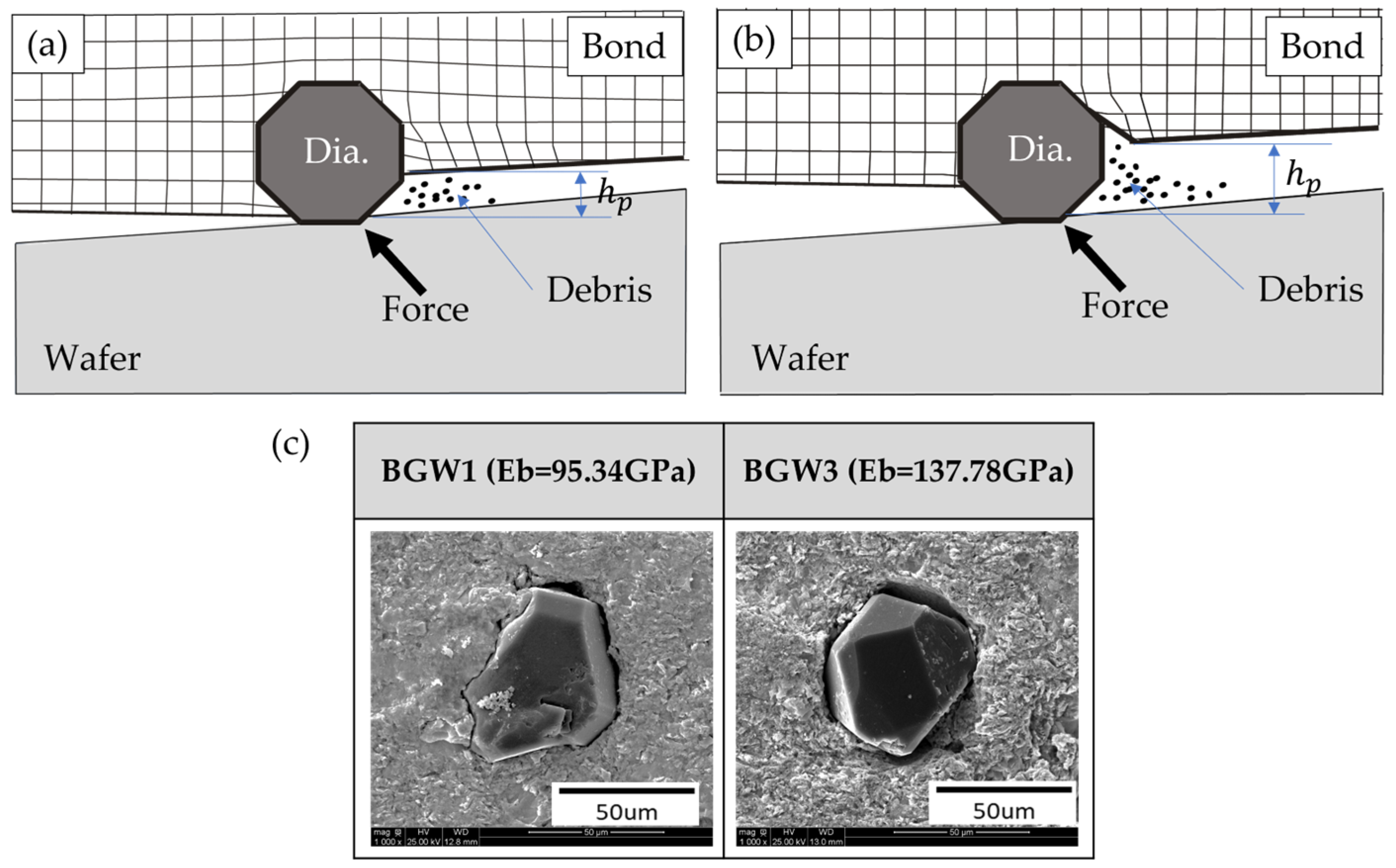 - (ii) High-toughness wafers (e.g., sapphire, 4H-SiC): The upper Eb range is used to secure sufficient hp but paired with controlled dressing to avoid overly stiff behavior.