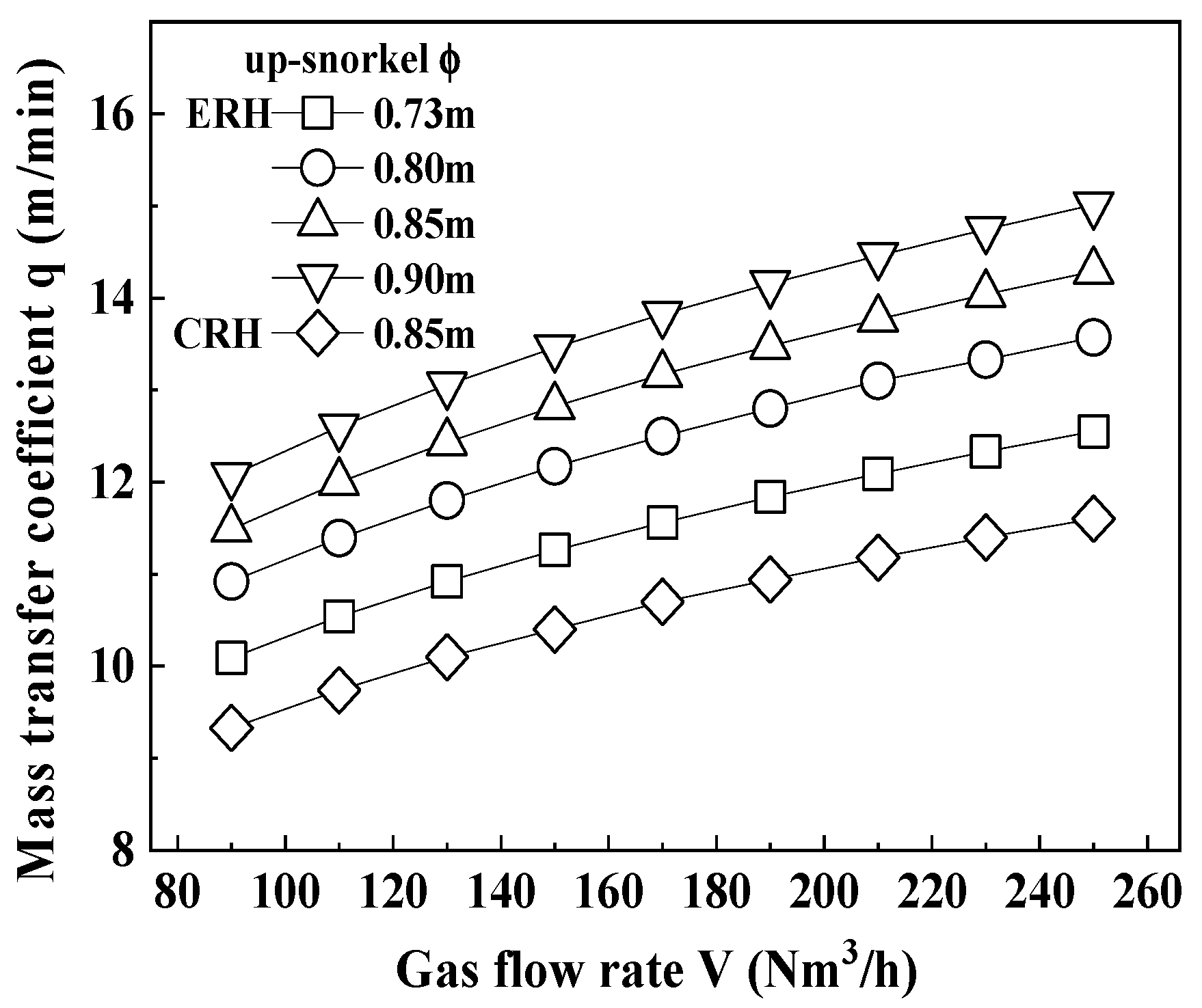 | Gas Flow Rate V (Nm3/h) | Circulation Flow Rate Q (ton/min) | Mass Transfer Coefficient q (m/min) | Decarburization Rate Constant Kc (min−1) | |