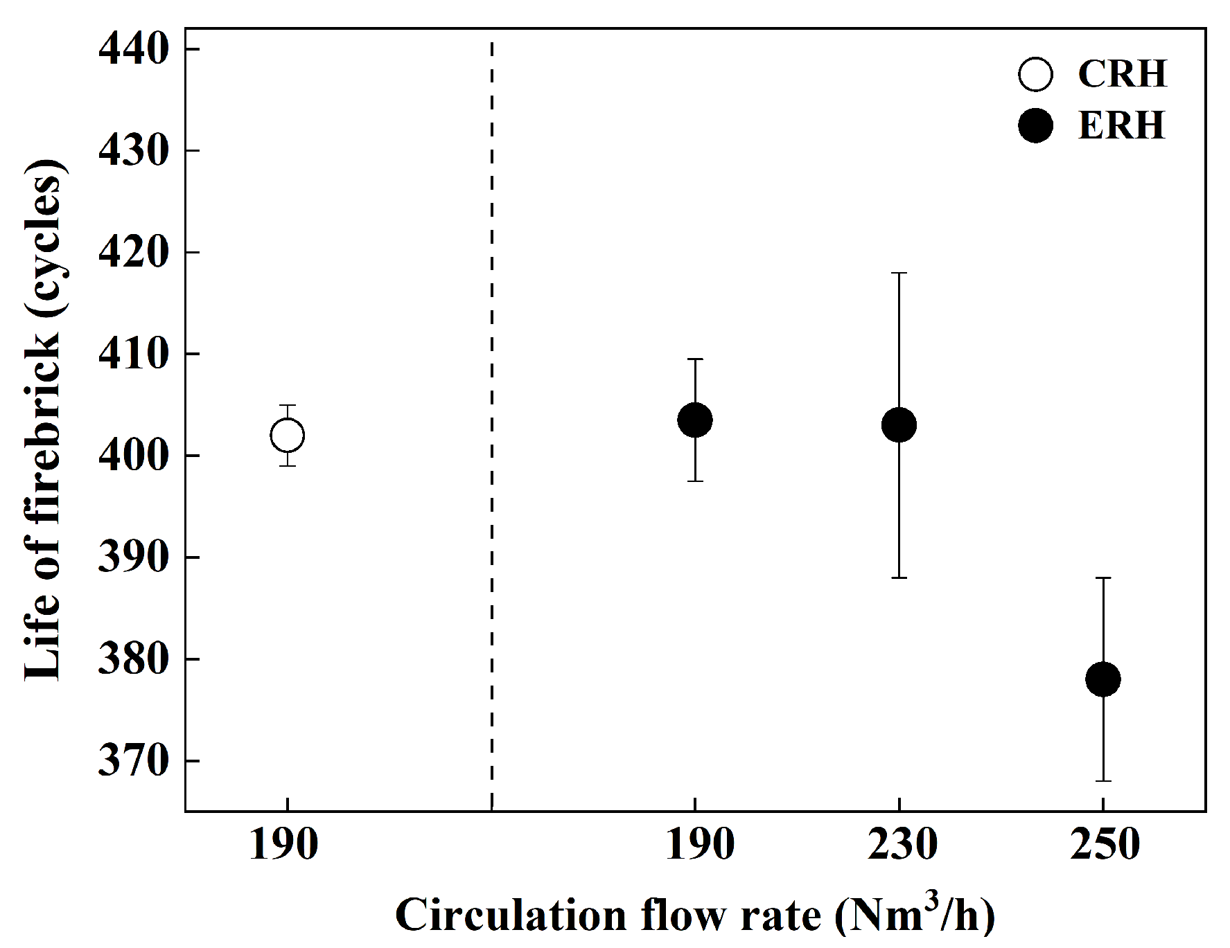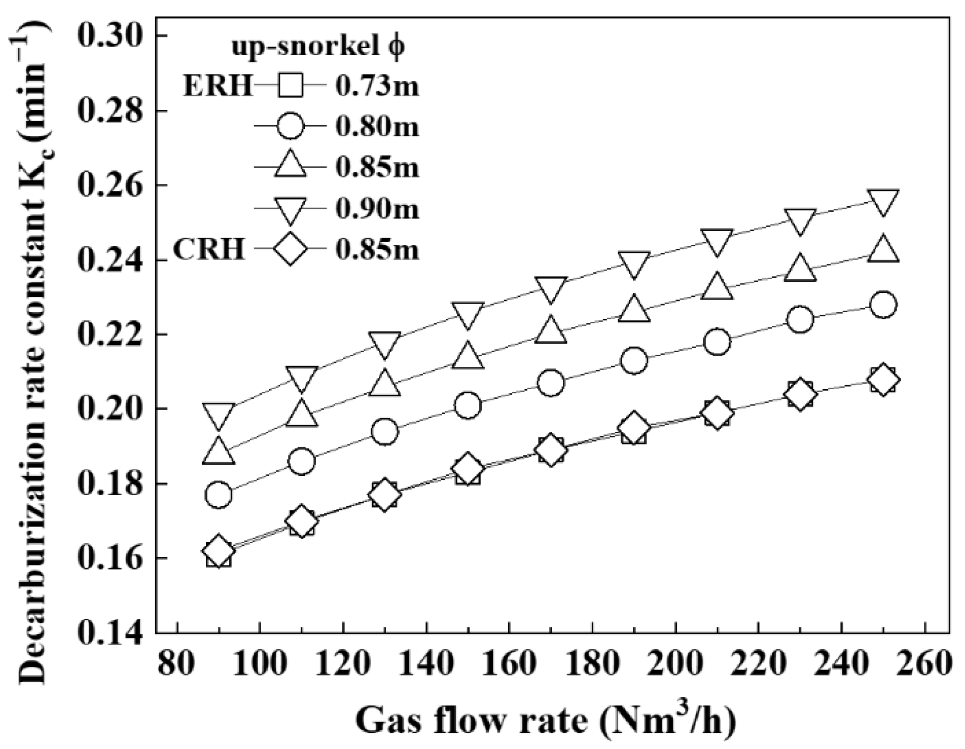- Both CRH and ERH showed increased decarburization with prolonged circulation times at the same circulation gas flow rate (190 Nm3/h), while ERH exhibited greater decarburization than CRH, especially as the circulation gas flow rate increased. The highest decarburization occurred with a circulation gas flow rate of 250 Nm3/h, leading to a reduced lifespan of the up-snorkel and RH lower firebrick. Therefore, the optimal circulation gas flow rate was determined to be 230 Nm3/h.