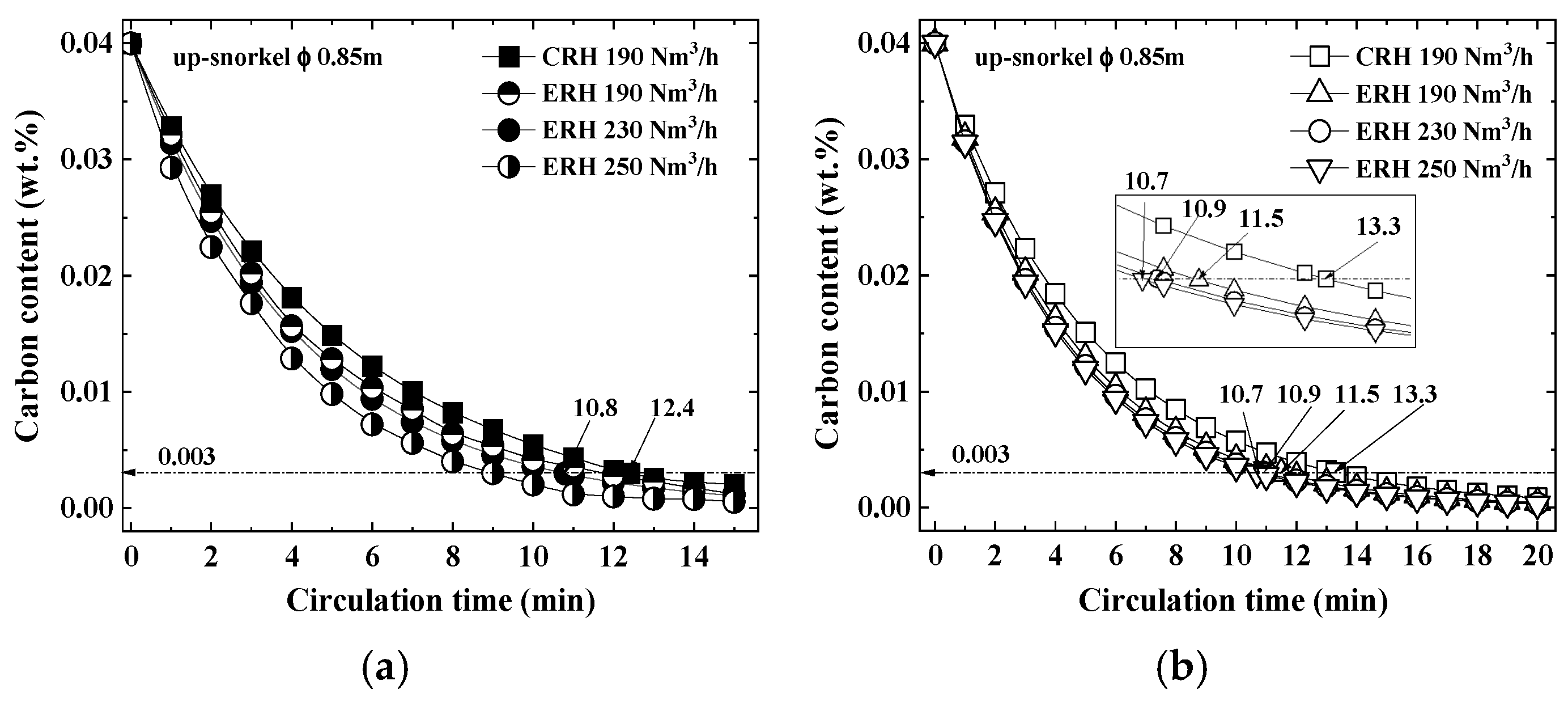 - The experimental decarburization times required to reach the 0.003 wt% carbon content in ultra-low carbon steel were 12.4 min for CRH and 10.8 min for ERH, with ERH showing a reduction of 1.6 min. Conversely, the calculated decarburization times were 13.3 min for CRH and 10.9 min for ERH, with ERH achieving a reduction of 2.4 min. As a result, the calculated time was 0.8 min longer than the experimental time.