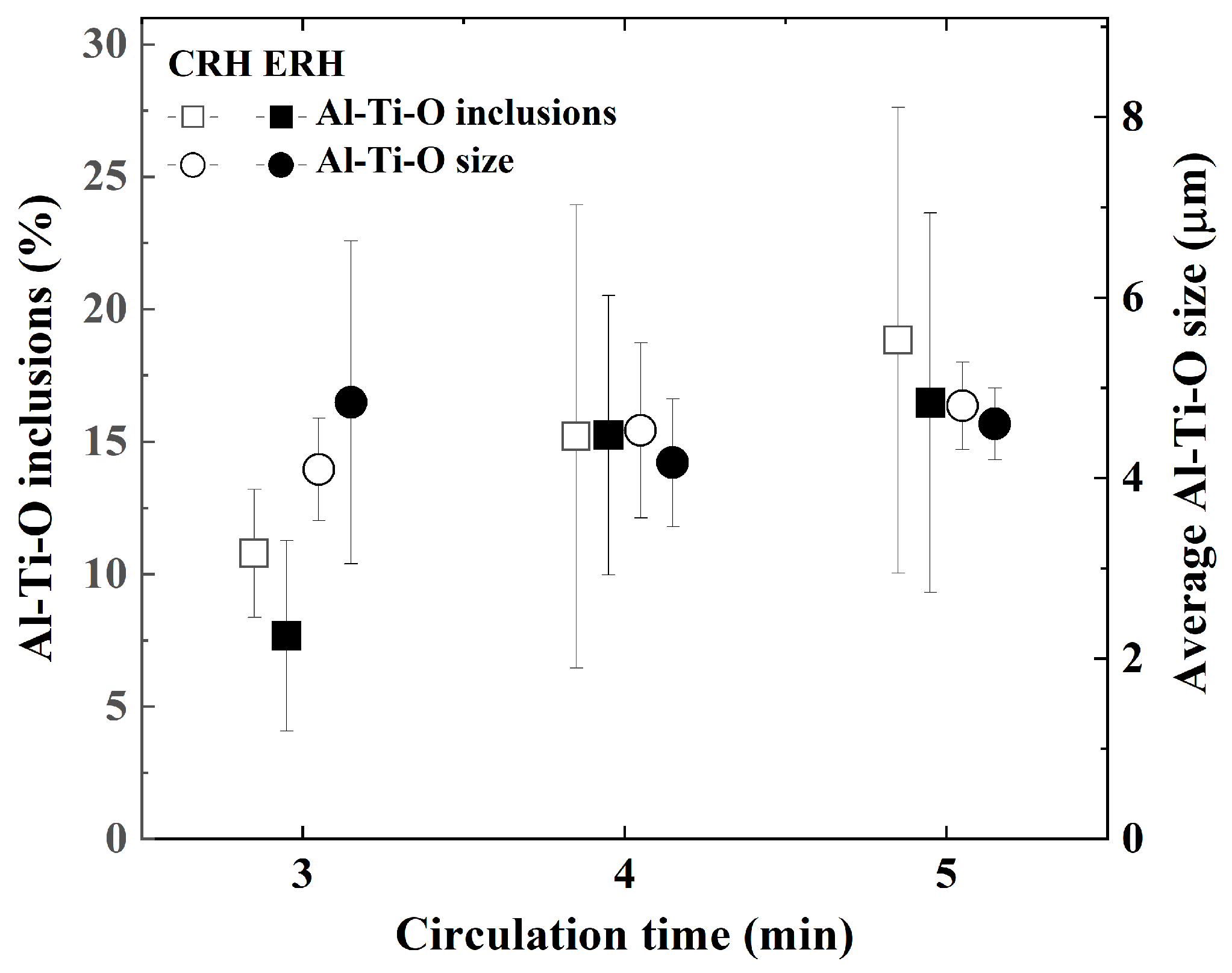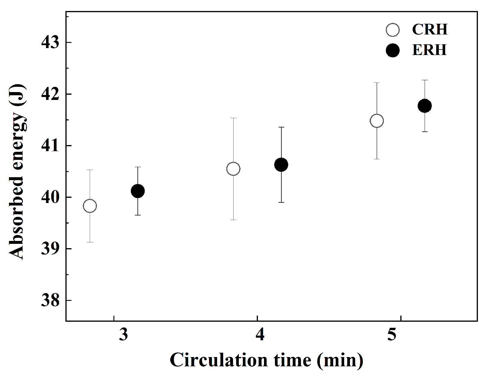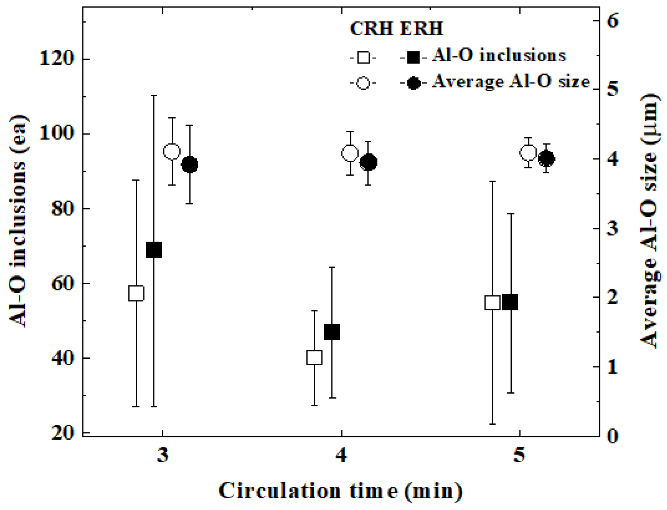 - There were no significant differences in inclusions characteristics between CRH and ERH at circulation times of 3, 4, and 5 min. However, the mechanical properties of ERH proved to be slightly superior at 4 and 5 min, leading to a decision based on economic feasibility. Hence, the expansion of the lower area of the RH degasser was to improve productivity and contribute to a reduction in production costs.