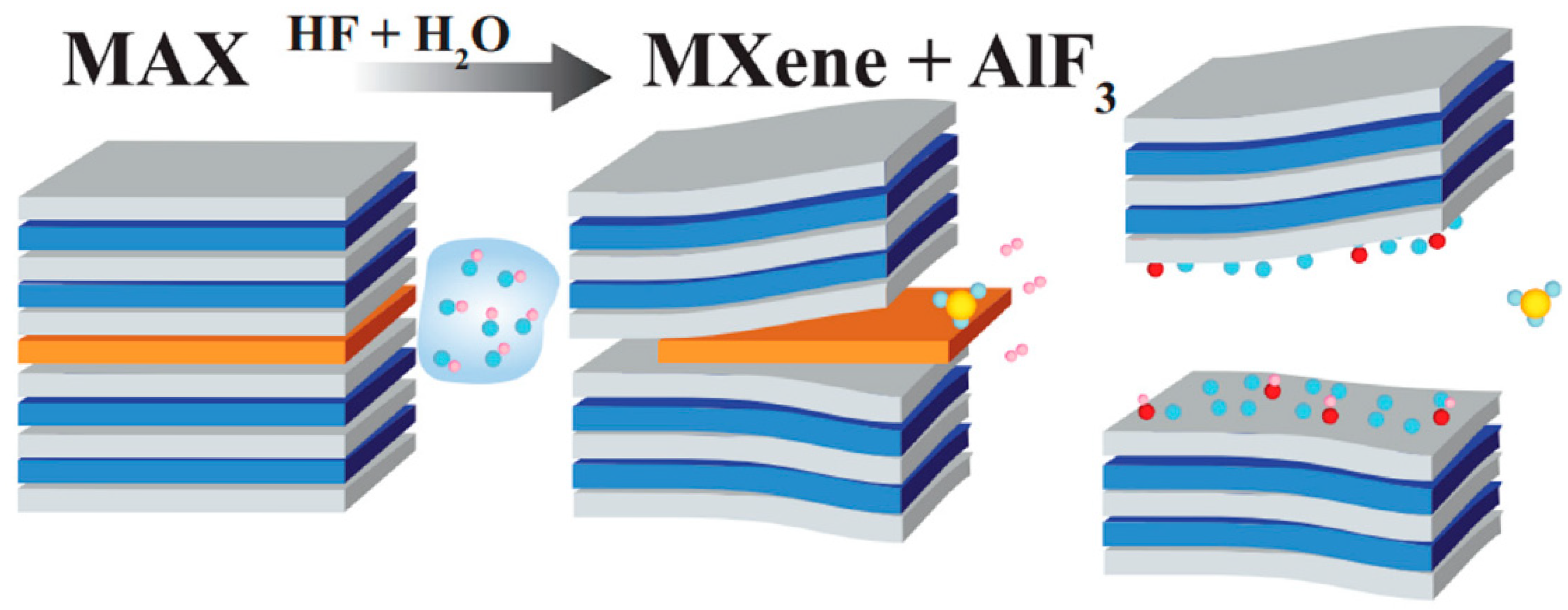 - Thakur, A.; Chandran, B.S.N.; Davidson, K.; Bedford, A.; Fang, H.; Im, Y.; Kanduri, V.; Wyatt, B.C.; Nemani, S.K.; Poliukhova, V.; et al. Step-by-Step Guide for Synthesis and Delamination of Ti3C2Tx MXene. Small Methods 2023, 7, 2300030. [Google Scholar] [CrossRef]