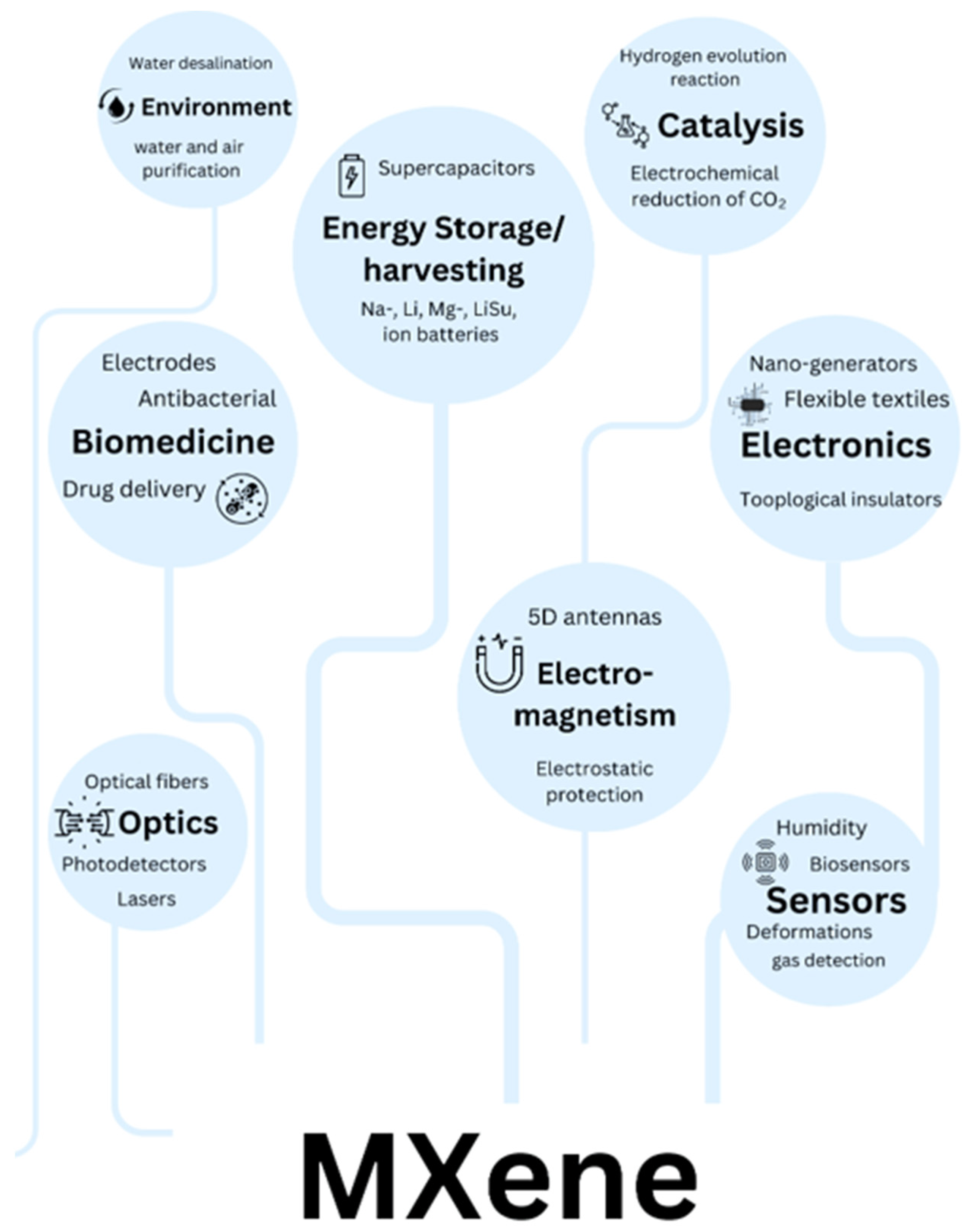 - Li, H.; Fan, R.; Zou, B.; Yan, J.; Shi, Q.; Guo, G. Roles of MXenes in Biomedical Applications: Recent Developments and Prospects. J. Nanobiotechnol. 2023, 21, 73. [Google Scholar] [CrossRef]