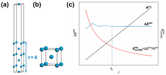 The variable in Equation (29) belongs to the smallest repeat unit in the (hkl) surface, as shown in Figure 10a, exhibiting determined values. represents the constant value that consistently approaches at different t values when the surface area is considered . Meanwhile, is a constant. Hence, the value only depends on the number of atomic layers (t). Based on the given information, it is highly likely that the dependence of the value on the arbitrarily chosen and is essentially the dependence of on t.