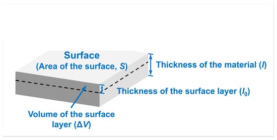 Taking W metal as an example, the variable is the surface area of the W sample, is the specific surface energy of W at 0 K, and is the volume of the surface layer providing surface energy for the system. Moreover, and are the molar mass and the density of W, respectively. The numerator in Equation (6) represents the energy provided by the atoms in the surface layer of the material; the denominator represents the mole number of atoms in the surface layer. Correspondingly, the selection of each variable is shown in Figure 2.