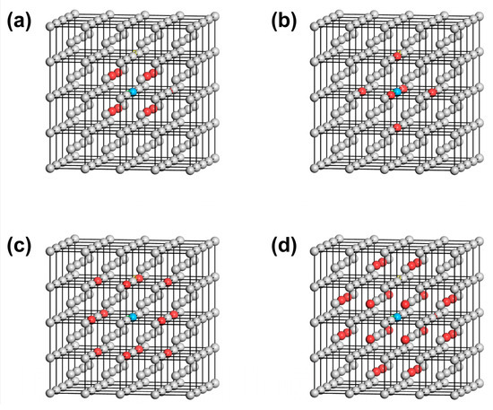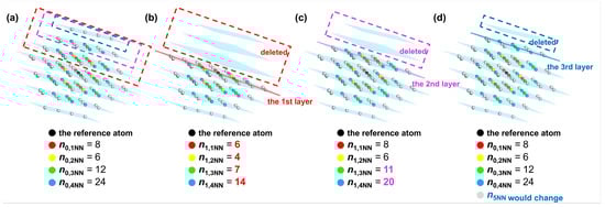 According to Equations (12) and (13), the energy change induced by the cleavage operation considering interatomic interactions between the reference atom and its first to fourth nearest neighbor atoms is equal to the sum of the energy change when cleavage is carried out along the first to the third W(110) crystal planes for a single W atom, which is deduced as follows. Variable represents the number of the k-th nearest neighbor atoms to the reference atom before cleavage. In contrast, those k-th nearest neighbor atoms after cleavage are denoted as variable . When cleavage is carried out along the first W(110) layer, the atoms located in the first to fourth nearest neighbors to the reference atom exhibit the change illustrated in Figure 5a to Figure 5b. It can be shown that the number of the first nearest neighbor atoms (colored red) changes from 8 to 6, and the number of second nearest neighbor atoms (colored yellow) changes from 6 to 4. Meanwhile, the number of third and fourth nearest neighbor atoms (colored green and blue) changes from 12 to 7 and from 24 to 14, respectively. Similarly, when the cleavage is applied along the second and third W(110) layer, the first to fourth nearest-neighbor atoms are changed from the initial distribution in Figure 5a to those shown in Figure 5c,d, respectively. The grey atoms represent atoms situated more than the fourth nearest-neighbor distance from the reference atom. Since the cutoff distance of the interatomic interactions is set between the fourth and fifth nearest-neighbor distances, the cohesive and repulsive interactions of the first to fourth nearest neighbors are included in calculations of the energy per atom. The interactions of the fifth and higher nearest neighbor atoms are not considered in this analysis.