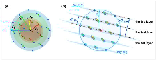 The reference atom can be arbitrary in the bulk phase. The first to fourth nearest neighbor atoms (colored in red, yellow, green, and blue) of the reference atom (colored in black) in the perfect crystal arrangement of W are illustrated in Figure 4a. In the meantime, the W(110) crystal plane where the reference atom is located can be set as the first W(110) layer. Since the interplanar spacing of the W(110) crystal plane is = 2.2380 Å, there is also a distribution of atoms in parallel planes at distances from the first W(110) layer that are integer multiples of , such as , , and so on. The parallel plane at a distance = 2.2380 Å from the first layer is set to the second W(110) layer for research purposes. Similarly, the third layer is set at a distance = 4.4760 Å from the first W(110) layer, as illustrated in Figure 4b.