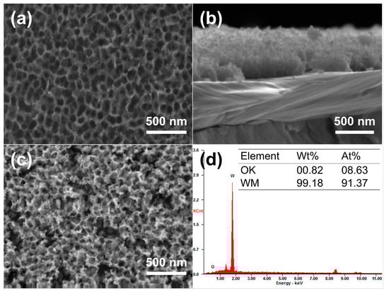 Morphologies and chemical compositions of the nanoporous W layer. (a) Surface and (b) cross-section morphologies of the nanoporous W layer after anodization; (c) surface morphology and (d) corresponding EDS results of the nanoporous layer after deoxidation annealing at 600 °C.