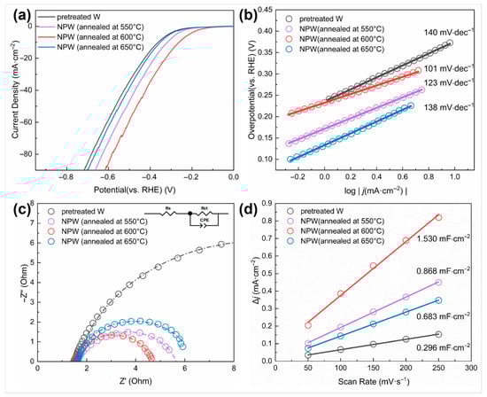 Electrochemical properties of W samples before and after nano-treatment under different deoxidation annealing conditions. (a) Polarization curves and (b) the corresponding Tafel plot; (c) Nyquist plots of the W samples under the potential of −0.30 V (vs. RHE) (Inset is the equivalent circuit model; —charge transfer resistance, —Ohmic series resistance, CPE—constant phase element); (d) plot of capacitive current density as a function of scan rate to compare double-layer capacitance ().