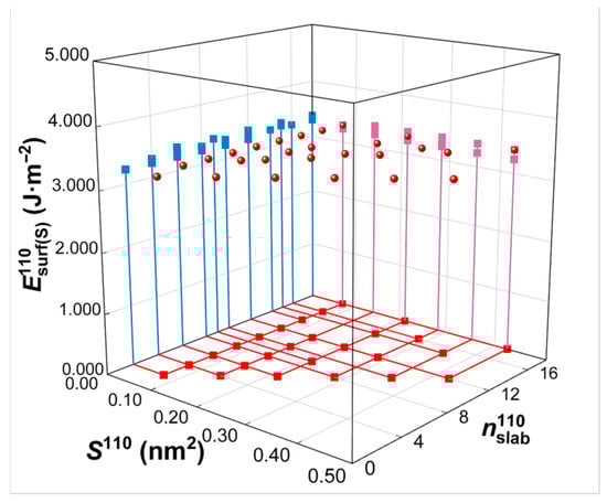 Surface energy calculation in units of J/m2. represents the surface energy for variations in surface area () and total number of atoms () according to the surface slab model of the W(110) crystal plane. The projection of the three-dimensional coordinates onto the three coordinate planes is illustrated in different colors.