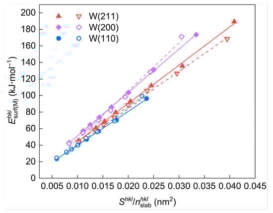 In Equations (2) and (3), is the total energy of the (hkl) surface slab model, while is the energy of the bulk W (bulk model, i.e., the conventional unit cell adopted in this method). The surface area, denoted as , is the contact surface area between the vacuum and outermost atomic layers. is the total number of atoms in the (hkl) surface slab model. The quantity of atoms in the bulk W is represented by the variable , which equals 2 for the W conventional unit cell. Therefore, represents the multiplicative relationship between the number of atoms in the surface slab and bulk models.