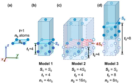 Schematics of surface slab models constructed with different parameters. (a) model of the W(110) crystal plane, while the cleavage thickness is the minimum, and the surface area is equal to , the smallest repeat unit (—the number of atoms in the smallest repeat unit of a monolayer); (b) model of the W(110) crystal plane, with the number of atomic layers and surface area , denoted as Model 1; (c) Model 1 after four times area expansion in the XOY plane, denoted as Model 2; (d) Model 1 with an increase in the number of atomic layers to after increasing the cleavage thickness, denoted as Model 3. Atoms of different colors represent the relationship between the number and distribution of atoms in different models.