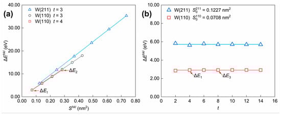 Influence of selected parameters (a) and (b) for model construction on the energy difference (). The calculation results are derived from the surface slab model for W(110) and W(211) crystal planes. The values of Model 1 to Model 3 in Figure 10 are denoted as , , and .