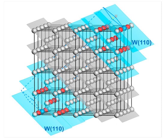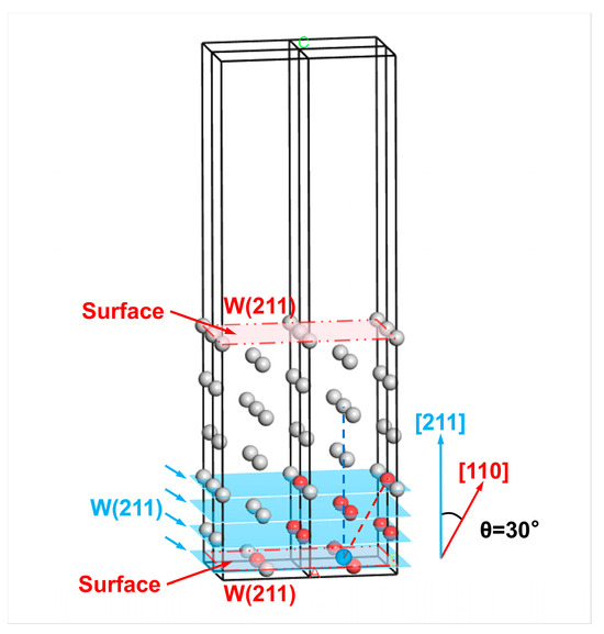 For example, the selection of surface layer atoms of a W(211) surface is shown in Figure 13. The crystal plane angle satisfies , i.e., . Then, the number of atomic layers in the surface layer should equal the projection of the third nearest-neighbor distance in the direction normal to the W(211) crystal plane (i.e., ) divided by the interplanar spacing of the W(211) crystal plane. Since the calculations of surface energies are based on the surfaces at both ends of the slab model, the final selected number of atomic layers in the surface layers meets , where represents the smallest integer greater than or equal to [30]. The relationship between and the crystal plane index can be summarized as follows:
