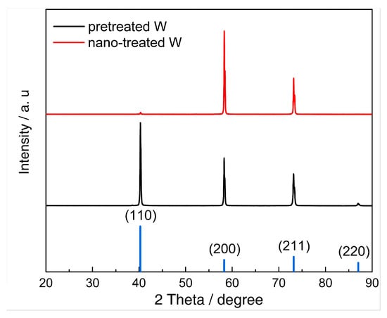 The surface and cross-sectional morphology of the W nanoporous structures were examined by a thermal field emission scanning electron microscope (JSM-7800F, JEOL Ltd., Tokyo, Japan). Meanwhile, the equipped energy dispersive spectrometer (EDS) detector was used to characterize the chemical composition. In addition, XRD analysis was utilized to analyze the crystal structure of the W surface before and after nano-treatment. Tests were conducted on a Bruker Advance D8 diffractometer (D8 Advance, Bruker AXS, Karlsruhe, Germany) with CuKα radiation (λ = 1.5406 Å), scanning in the 2θ range from 20° to 90° at the rate of 4°/min.
