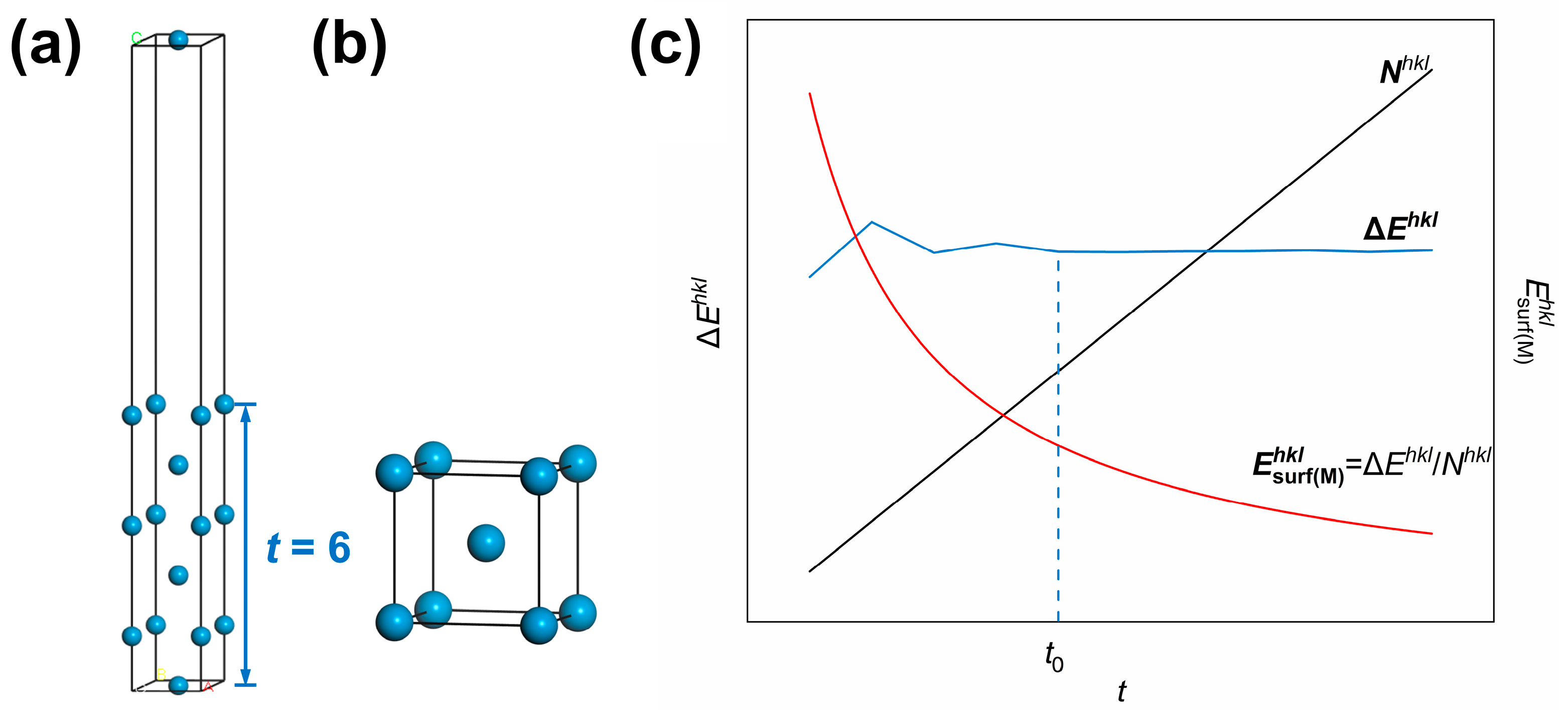 It can be seen from Equation (5) that surface energies in units of kJ/mol is actually obtained by dividing the formation energy for surfaces by cleavage Δ E h k l by the mole number of atoms in the surface slab model N h k l . Since N h k l is the product of N 0 h k l , the number of atoms within a monolayer and t, the number of atomic layers, the dependence of E surf ( M ) h k l , Δ E h k l and N h k l on t can be analyzed as below. Taking the W(110) crystal plane as an example, the curves of E surf ( M ) h k l , Δ E h k l and N h k l as a function of the number of atomic layers in the surface slab model (t) are plotted in Figure 1c. It can be seen in the plot that Δ E h k l fluctuates and then stabilizes as t increases and finally converges to a stable value after t > t 0 . Meanwhile, N h k l has been monotonically increasing with t. As a result, the surface energy of the (hkl) crystal plane in units of kJ/mol ( E surf ( M ) h k l ) experiences a reduction with the rise of t, so a stable value of E surf ( M ) h k l cannot be obtained.