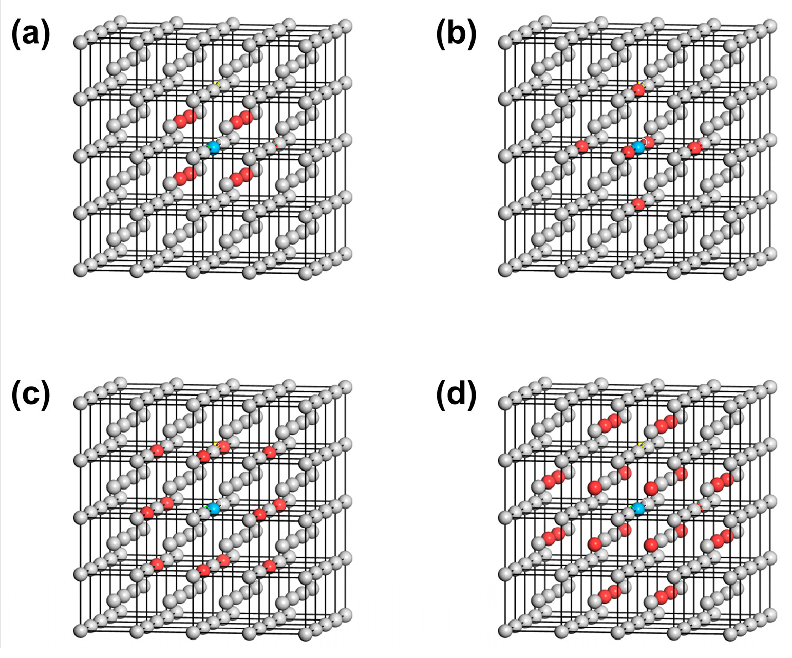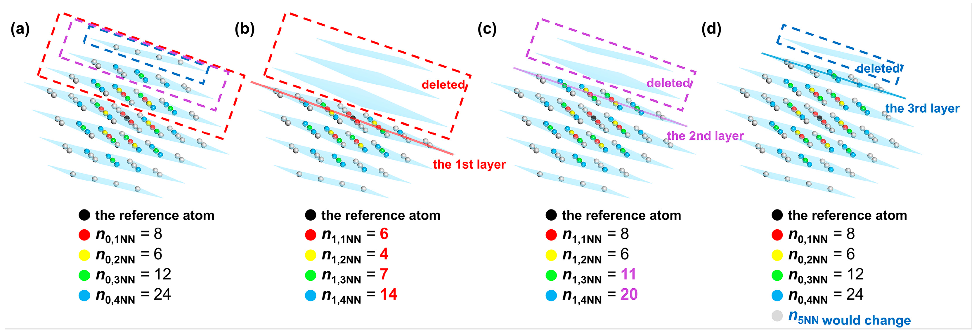 According to Equations (12) and (13), the energy change induced by the cleavage operation considering interatomic interactions between the reference atom and its first to fourth nearest neighbor atoms is equal to the sum of the energy change when cleavage is carried out along the first to the third W(110) crystal planes for a single W atom, which is deduced as follows. Variable n 0 , k NN represents the number of the k-th nearest neighbor atoms to the reference atom before cleavage. In contrast, those k-th nearest neighbor atoms after cleavage are denoted as variable n 1 , k NN . When cleavage is carried out along the first W(110) layer, the atoms located in the first to fourth nearest neighbors to the reference atom exhibit the change illustrated in Figure 5a to Figure 5b. It can be shown that the number of the first nearest neighbor atoms (colored red) changes from 8 to 6, and the number of second nearest neighbor atoms (colored yellow) changes from 6 to 4. Meanwhile, the number of third and fourth nearest neighbor atoms (colored green and blue) changes from 12 to 7 and from 24 to 14, respectively. Similarly, when the cleavage is applied along the second and third W(110) layer, the first to fourth nearest-neighbor atoms are changed from the initial distribution in Figure 5a to those shown in Figure 5c,d, respectively. The grey atoms represent atoms situated more than the fourth nearest-neighbor distance from the reference atom. Since the cutoff distance of the interatomic interactions is set between the fourth and fifth nearest-neighbor distances, the cohesive and repulsive interactions of the first to fourth nearest neighbors are included in calculations of the energy per atom. The interactions of the fifth and higher nearest neighbor atoms are not considered in this analysis.